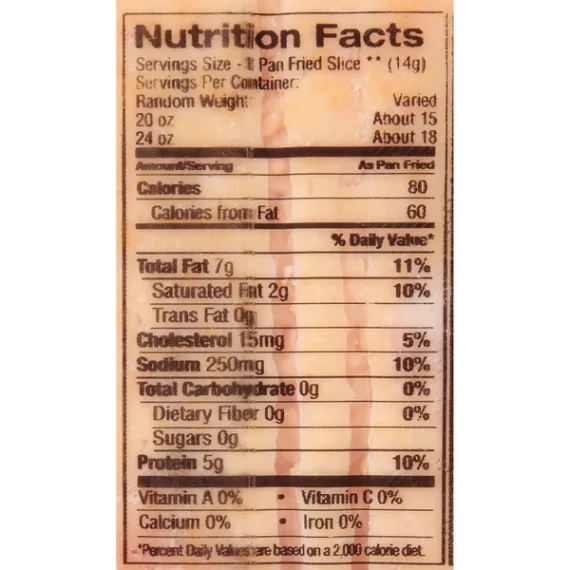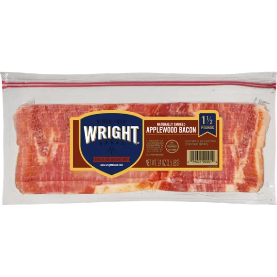 Details Ingredients Cured with water, salt, sugar, sodium phosphate, sodium erythorbate, sodium nitrite. Product features The uncompromising flavor of Wright Brand® Applewood Smoked Bacon doesn't come easy. Hand selected pork belly is trimmed into thick marbled slices, then cured with our 90-year-old recipe and smoked over real applewood chips for a smoky and slightly sweet aroma you can count on. For peak flavor, simply lay bacon slices flat on a cookie sheet and bake at 350⁰F for 15-20 minutes or until crispy and golden brown. To serve, cook up bacon with eggs, peppers, onions and cheese for a hearty breakfast skillet. Includes one 1.5 lb. package of Thick Sliced Applewood Smoked Bacon. This country has a history of making great things. A tradition of working hard, not cutting corners and taking the time to do it right. At Wright® Brand, we still believe in this tradition. We know if you want to make a better bacon, there's only one way to do it: hand selected, hand trimmed, and smoked over real wood chips. That's Bacon the Wright Way™. One 1.5 lb. package of Applewood Smoked BaconNaturally wood smoked over applewood chipsHand selected and hand trimmedThicker, fuller-flavored slices of baconCured with our 90-year-old recipe for rich flavorPackaged in a resealable bagBake at 350⁰F for 15-20 minutes or until crispy and golden brownA great addition with any hearty breakfast Special Features Sliced applewood smoked bacon Net Quantity of Content 18.0 X 14 g