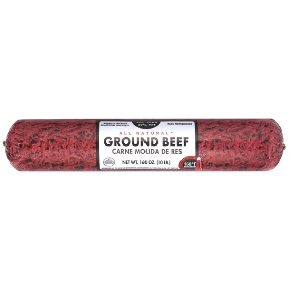 Details Ingredients Ground Beef Product features There's nothing like cooking from scratch, especially when you start with All Natural* 73/27 Lean Ground Beef. Made with quality USDA approved beef and no artificial ingredients, our all natural* ground beef is juicy, tender and flavorful. Our beef is an excellent source of protein, vitamin B6, vitamin B12, zinc, niacin, selenium and a good source of phosphorous, riboflavin, iron and choline. All 10 essential minerals are naturally found in beef and are a flavorful way to give your body nutrients to help power through the day. Great for sautéing or grilling, our ground beef is a delicious addition to your favorite recipes. Simply cook and serve with asparagus, bow tie pasta and pesto sauce for a hearty weeknight dinner. Ground Beef should be cooked to a safe internal temperature of 160°F. Includes one package. *Minimally processed, no artificial ingredients 10 Pound 73/27 Ground Beef Roll:Easy to store and keep for later useConveniently packaged and requires only simple preparation100% pure ground beefNo artificial ingredients10 lb package of gluten-free beefExcellent source of protein, B vitamins, iron and zincIdeal for grilling or cooking in a skillet Net Quantity of Content 40 X 4 oz