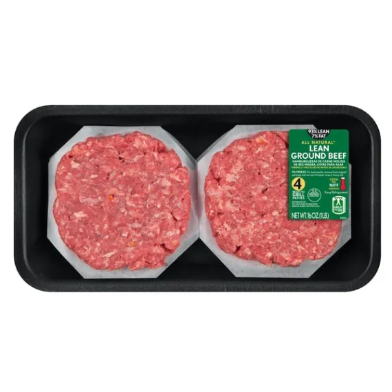 Details Ingredients Ground Beef and Natural Flavorings Product features Start your grill and get cooking with All Natural* 93/7 Lean Ground Beef Patties. Made with quality USDA approved beef and no artificial ingredients, our all natural* ground beef patties are juicy, tender and flavorful. Our beef is an excellent source of protein, vitamin B6, vitamin B12, zinc, niacin, selenium and a good source of phosphorous, riboflavin, iron, and choline. All 10 essential minerals are naturally found in beef and are a flavorful way to give your body nutrients to help power through the day. Great for sautéing or grilling, our ground beef is a delicious addition to your favorite recipes. Simply cook and serve with avocado, lettuce and tomato for a delicious weekend lunch. Ground Beef should be cooked to a safe internal temperature of 160°F. Includes one package. *Minimally processed, no artificial ingredients. One package of 93/7 Lean Ground Beef PattiesExcellent source of protein, vitamin B6, vitamin B12, zinc, niacin, selenium and a good source of phosphorous, riboflavin, iron, and cholineAll natural, minimally processed beef with no artificial ingredientsDelicious addition to your favorite recipes