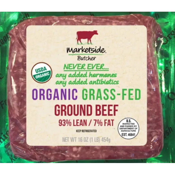 Details Ingredients 100% Organic Grass-Fed Beef Product features Marketside Butcher Organic Grass-Fed Ground Beef is a high quality Organic option for beef lovers. It is flavorful and tender, and can be cooked with your choice of ingredients to create the recipies you love.The beef comes from cattle that are grass-fed, without any added hormones or added antibiotics, and is certified organic. You can use it in meatloaf, sloppy joes, tacos, lasagna spaghetti bolognese, hamburgers and many more. Taste the grass-fed difference with Marketside Organic Ground Beef.Fresh ideas and quality ingredients, that's how Marketside Butcher brings the best foods to your table. We are committed to deliver freshness that you can taste and see. Marketside Butcher offers the best in fresh food, guaranteed by Walmart, working in partnership with Farmers and Ranchers for the highest quality. No added hormones or antibiotics93% lean ground beef is USDA organicUS inspected and passed by the Department of Agriculture93% lean and 7% fat