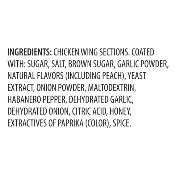 Details Ingredients CHICKEN WING SECTIONS. COATED WITH: SUGAR, SALT, BROWN SUGAR, GARLIC POWDER, NATURAL FLAVORS (INCLUDING PEACH), YEAST EXTRACT, ONION POWDER, MALTODEXTRIN, HABANERO PEPPER, DEHYDRATED GARLIC, DEHYDRATED ONION, CITRIC ACID, HONEY, EXTRACTIVES OF PAPRIKA (COLOR), SPICE. Show more Product features There's nothing like cooking from scratch, especially when you start with Freshness Guaranteed Peach Habanero Seasoned Chicken Wings. Seasoned with a sweet and spicy peach habanero dry rub, our chicken wings are juicy and tender with 17 grams of protein and 0 grams of trans fat per serving. Perfect for grilling and frying, simply cook and serve our seasoned chicken wings with grilled vegetables for a quick and delicious weeknight dinner. Great for a quick weeknight dinner, game day grazing, or your next potluck, Freshness Guaranteed Peach Habanero Seasoned Chicken Wings are sure to be a hit! Freshness Guaranteed provides you and your family with high-quality fresh food that saves you time and money, many of which are cooked fresh or prepared in stores. Convenient solutions with value added in every Spark Fresh item. Freshness Guaranteed Peach Habanero Seasoned Chicken Wings, 1.6-1.8 lb: Chicken wing sections seasoned with a peach habanero dry rub 17 grams of protein per serving 0 grams of trans fat per serving Keep refrigerated or frozen Perfect for grilling and frying