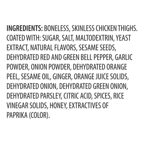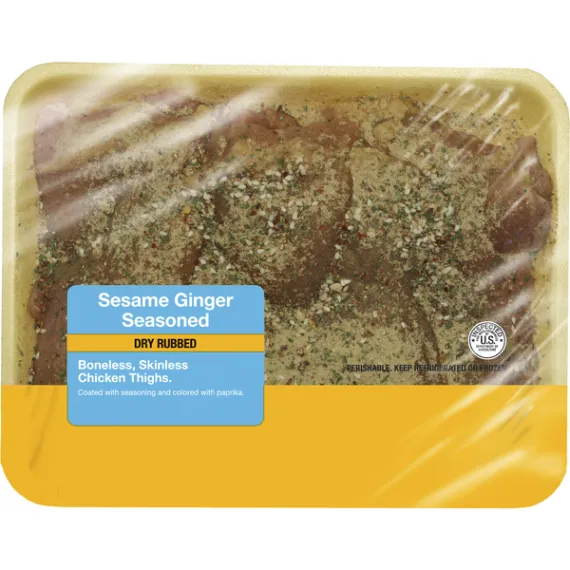 Details Ingredients BONELESS, SKINLESS CHICKEN THIGHS. COATED WITH: SUGAR, SALT, MALTODEXTRIN, YEAST EXTRACT, NATURAL FLAVORS, SESAME SEEDS, DEHYDRATED RED AND GREEN BELL PEPPER, GARLIC POWDER, ONION POWDER, DEHYDRATED ORANGE PEEL, SESAME OIL, GINGER, ORANGE JUICE SOLIDS, DEHYDRATED ONION, DEHYDRATED GREEN ONION, DEHYDRATED PARSLEY, CITRIC ACID, SPICES, RICE VINEGAR SOLIDS, HONEY, EXTRACTIVES OF PAPRIKA (COLOR). Show more Product features Cook up a delicious and hearty dinner with Freshness Guaranteed Sesame Ginger Boneless Skinless Chicken Thighs. These tender and juicy chicken thighs are USDA inspected and approved, so you can rest assured you are only serving the best to your family. They are coated in a yummy sesame ginger dry rub. Perfect for grilling, frying, sauteeing, or baking, these thighs are the perfect foundation for a scrumptious meal. Make crispy fried chicken, a flavor-packed stir fry, or throw them on the grill for a fantastic backyard barbecue. Serve up a hearty plate of Freshness Guaranteed Chicken Thighs for your dinner tonight! Freshness Guaranteed provides you and your family with high-quality fresh food that saves you time and money, many of which are cooked fresh or prepared in stores. Convenient solutions with value added in every Spark Fresh item. Freshness Guaranteed Sesame Ginger Boneless Skinless Chicken Thighs, 1.1-1.5 lb: Tender and juicy boneless, skinless chicken thighs USDA inspected Sesame ginger dry rubbed Great for frying, grilling, and baking
