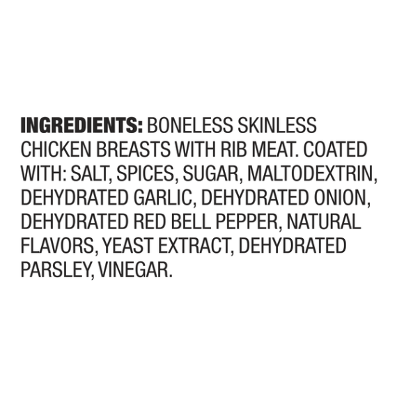 Details Ingredients Boneless skinless chicken thighs with rib meat. Coated with: salt, spices, sugar, maltodextrin, dehydrated garlic, dehydrated onion, dehydrated red bell pepper, natural flavor, yeast extract, dehydrated parsley, vinegar Show more Product features There's nothing like cooking from scratch, especially when you start with Freshness Guaranteed Thin Sliced Seasoned Boneless Skinless Chicken Breasts with Rib Meat. Seasoned with a savory Tuscan Style dry rub, our chicken is juicy and tender with 23 grams of protein and 0 grams of trans fat per serving. Perfect for grilling and frying, simply cook and serve our chicken breasts with steamed vegetables for a quick and delicious weeknight dinner. Includes one 1.25-1.75 lb. package of Chicken Drumsticks. One package of Freshness Guaranteed Tuscan Style Dry Rub Thin Sliced Boneless Skinless Chicken Breasts with Rib Meat, 1.25-1.75 lb. Seasoned with a savory Tuscan Style dry rub 21 grams of protein per serving 0 grams of trans fat per serving Keep refrigerated or frozen Perfect for grilling and frying Net Quantity of Content 150 X 4 oz (112g)