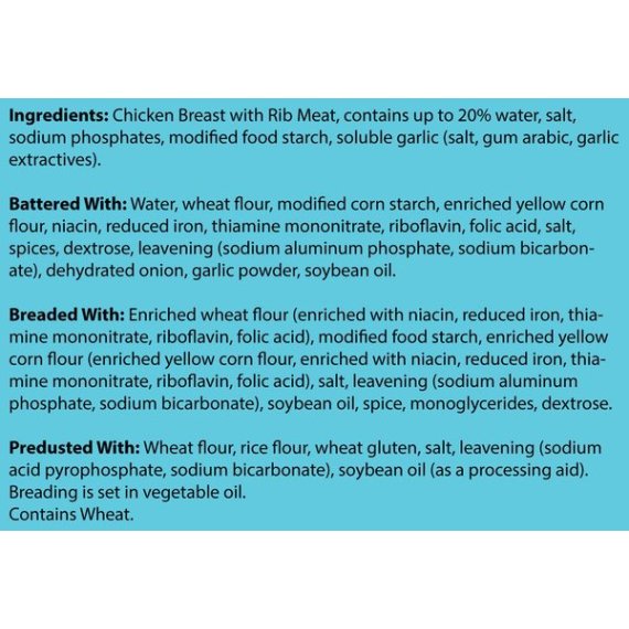 Details Ingredients Chicken breast with rib meat, contains up to 20% water, salt, sodium phosphates, modified food starch, soluble garlic (salt, gum Arabic, garlic extractives), battered with: water, wheat flour, modified food starch, enriched yellow corn flour (niacin, reduced iron, thiamine mononitrate, riboflavin, folic acid), salt, spices, dextrose. Leavening (sodium, aluminum phosphate, sodium bicarbonate), dehydrated onion, garlic powder, soybean oil. Breaded with: enriched wheat flour (enriched niacin, reduced iron, thiamine mononitrate, riboflavin, folic acid), modified food starch, enriched yellow corn flour (enriched with niacin, reduced iron, thiamine mononitrate, riboflavin, folic acid), salt, leavening (sodium aluminum phosphate, sodium bicarbonate), soybean oil, spice, monoglycerides, dextrose. Predusted with: wheat flour, rice flour, wheat gluten, salt, leavening (sodium acid pyrophosphate, sodium bicarbonate), soybean oil (as a processing aid), breading is set in vegetable oil Show more Product features Great Value Chicken Breast Strips are ready-to-cook chicken strips that can be used in a variety of delicious chicken recipes. They are covered by homestyle breading, and contain up to 20% of a solution that ensures a tender and juicy texture. They are made of carefully selected rib meat that create a rich, natural taste. You can choose to cook them by deep frying them or bake them in a conventional oven. With 2.5 lb of chicken, this bag is ideal for family sized meals and special occasions. The reclosable packaging lets you use a few strips at a time or all at once. With high-quality ingredients and a delicious taste, Great Value Chicken Breast Strips are an easy and convenient way to a good, hearty chicken meal. Great Value products provide families with affordable, high quality grocery and household consumable options. With our wide range of product categories spanning grocery and household consumables, we offer you a variety of products for your family’s needs. Our products are conveniently available online and in Walmart stores nationwide, allowing you to stock up and save money at the same time. Cooking Instructions Cook from frozen. The internal temperature of this chicken needs to reach 165°F as measured by a calibrated meat thermometer. Make sure your chicken is cooked thoroughly by checking the temperature in several spots. Deep Fryer Preheat frying oil to 350°F. Place frozen chicken pieces into frying oil. Fry for 8 minutes. Insert a meat thermometer into the thickest portion of the product. Continue frying until the internal temperature reaches 165°F. Conventional Oven Preheat oven to 375°F. Place frozen chicken pieces in a single layer on ungreased baking pan. Bake uncovers for 40 minutes. Insert a meat thermometer into the thickest portion of the product. Continue cooking until internal temperature reaches 165°F. Product Features Reclosable Ready to cook raw chicken Homestyle breading Ovenable / fryable walmart.com/greatvalue Net Quantity of Content 10 X 4 oz