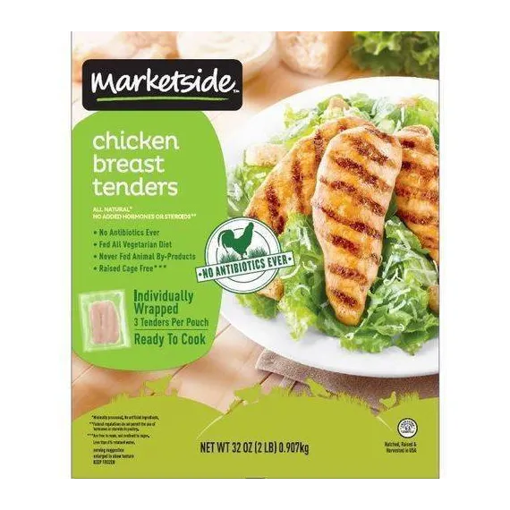 Details Product features Marketside Chicken Breast Tenders come from chickens that are hatched, raised cage-free and harvested in the USA. These all natural chicken tenders have no antibiotics or added hormones and steroids. Our chickens are fed an all vegetarian diet and never any animal by-products. They offer a nutritional benefit as they are an excellent source of protein. You are assured of great quality meats as they are USDA inspected. These chicken breast tenders are individually wrapped and ready to cook for your convenience. Enjoy fresh-from-the-farm taste with Marketside Chicken Breast Tenders. Fresh ideas and quality ingredients, that's how Marketside brings the best foods to your table. We are committed to deliver freshness that you can taste and see. Marketside offers the best in fresh food, guaranteed by Walmart, working in partnership with farmers, bakers and chefs for the highest quality, authentic ingredients and favorite recipes. Marketside Fresh Chicken Breast Tenders, 2lb: No antibiotics ever Fed all-vegetarian diet Never fed animal by-products Raised cage free Individually wrapped Ready to cook