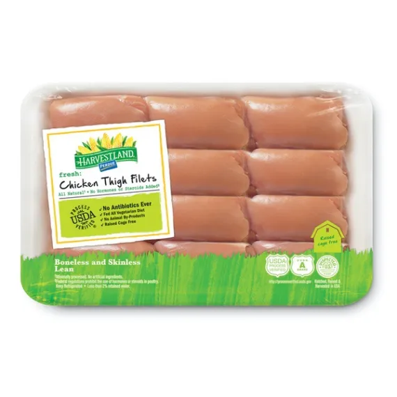 Details Product features Boneless skinless chicken thighs packed 12-14 pieces per tray. No Antibiotics Ever All Vegetarian Diet Cage Free No Hormones or Steroids* Chicken Hatched Raised and Harvested in the USA