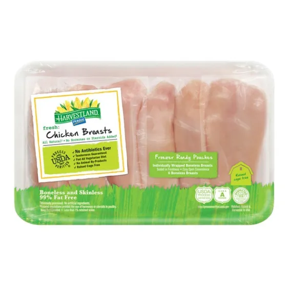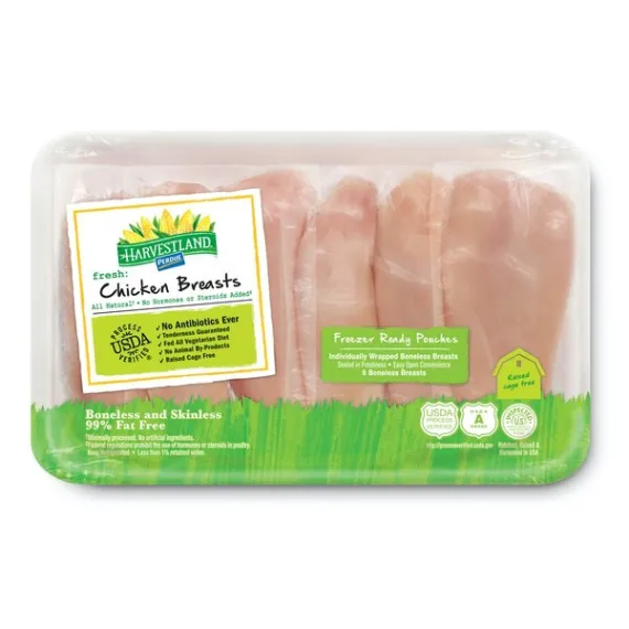 Details Ingredients Chicken. Product features Boneless skinless chicken breasts are individually wrapped in easy-open freezer-ready pouches. Six breasts per tray. No Antibiotics Ever All Vegetarian Diet Cage Free No Hormones or Steroids* Chicken Hatched Raised and Harvested in the USA