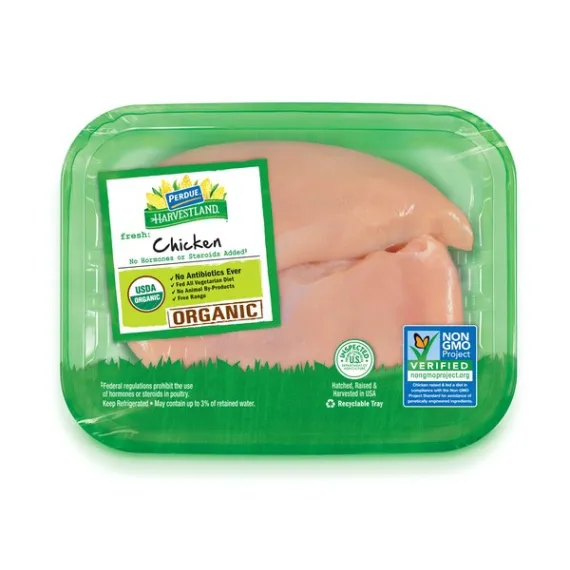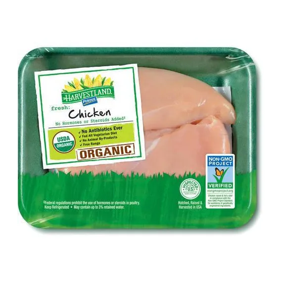 Details Product features Fresh organic boneless skinless chicken breasts are packed two to three breasts per recyclable tray. Organic Non GMO Project Verified All Vegetarian Diet No Animal By-Products Free Range