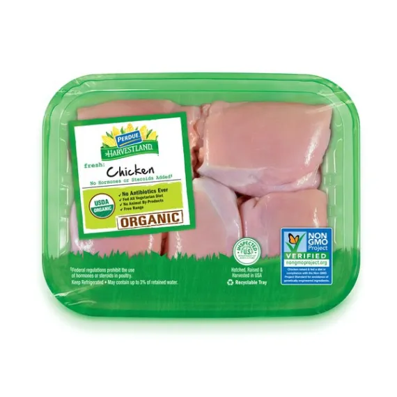 Details Product features Fresh organic boneless skinless chicken thighs are packed four (4) to six (6) thighs per recyclable tray. Organic Non GMO Project Verified All Vegetarian Diet No Animal By-Products Free Range