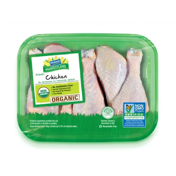 Details Product features Fresh organic chicken drumsticks are packed 5 to 6 drumsticks per recyclable tray. Organic Non GMO Project Verified All Vegetarian Diet No Animal By-Products Free Range