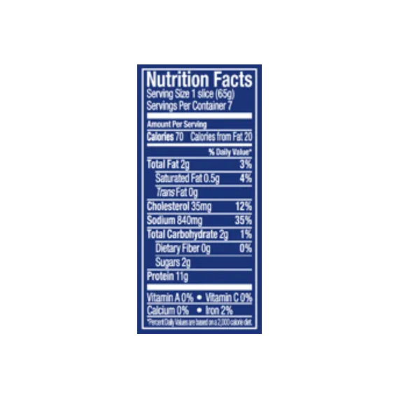 Details Ingredients CURED WITH: WATER, DEXTROSE, SALT, POTASSIUM LACTATE, SODIUM PHOSPHATES, SODIUM DIACETATE, SODIUM ERYTHORBATE, SODIUM NITRITE Show more Product features Farmland Hickory Smoked Ham takes flavor to a whole new level. Our tasty ham is 96% fat free and gluten free for healthier ham you can feel good about eating. Add a protein-packed option to your breakfast, lunch or dinner or enjoy an afternoon snack. You can indulge in Farmland Ham any time of the day! HICKORY SMOKED At Farmland, we work side by side with American farm families, hand trim our cuts and hickory smoke our fully cooked ham for an amazing, gourmet flavor. HEALTHIER HAM Farmland ham is gluten free and is 96% fat free, providing you with a healthier, tastier ham that your whole family will enjoy. Breakfast, lunch or dinner . . . Enjoy delicious ham anytime! PERFECT FOR ANY TIME Whether you are preparing a tasty breakfast, creating a new appetizer, topping a sandwich, or just wanting a quick snack, Farmland ham is the perfect choice for a mouth-watering morsel anytime. PROTEIN POWER Ham is a great source of energy-boosting protein. Forget dark chocolate, jerky and candied sweets, ham is the perfect snack to keep you satisfied and help get you through the day. PASSION FOR PORK At Farmland, we do things a certain way. We don’t cut corners. We don’t take the easy way out. And we never take chances when flavor is on the line. We’ve been bringing great-tasting food to people’s tables since 1959. Special Features 96% fat free Net Quantity of Content 7 X 65 g