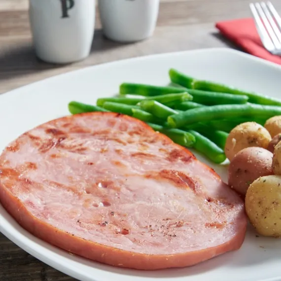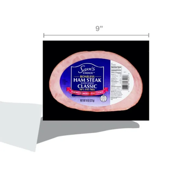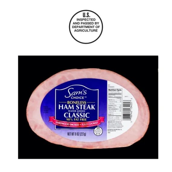 Details Ingredients CURED WITH: WATER, CONTAINS LESS THAN 2% OF SALT, SUGAR, POTASSIUM LACTATE, SODIUM DIACETATE, DEXTROSE, SODIUM PHOSPHATE, POTASSIUM CHLORIDE. SODIUM ERYTHORBATE, SODIUM NITRITE Show more Product features Sam's Choice Boneless Ham Steak has a hardwood smoked flavor that the entire family will enjoy. Use this ham to make deli-style sandwiches topped with lettuce, tomato, and mayonnaise. Heat it up and enjoy it with a side of green beans and mashed potatoes. It would also be part of a great breakfast. You could fry it in a cast iron skillet and serve with cheesy eggs and biscuits. Our ham steak is fully cooked and is 98% fat free. Plus, it’s USDA inspected, ensuring great quality. Enjoy fresh-from-the-deli taste with Sam's Choice Boneless Ham Steak. Named after our iconic founder, Walmart's Sam's Choice brand provides families with premium, high-quality food and grocery options with the best value. With our wide range of products spanning grocery, packaged food, pre-packaged deli, dairy and frozen food, we offer you a tailored assortment that is both innovative and enticing. Our authentic products are inspired by our proud heritage and are trusted today by the millions of customers using them across the nation. Sam's Choice Boneless Ham Steak, 8 oz: Fully cooked, hardwood smoked About 2 ½ servings per package 98% fat free 14 grams of protein per serving USDA inspected Net Quantity of Content 2.5 X 3 oz