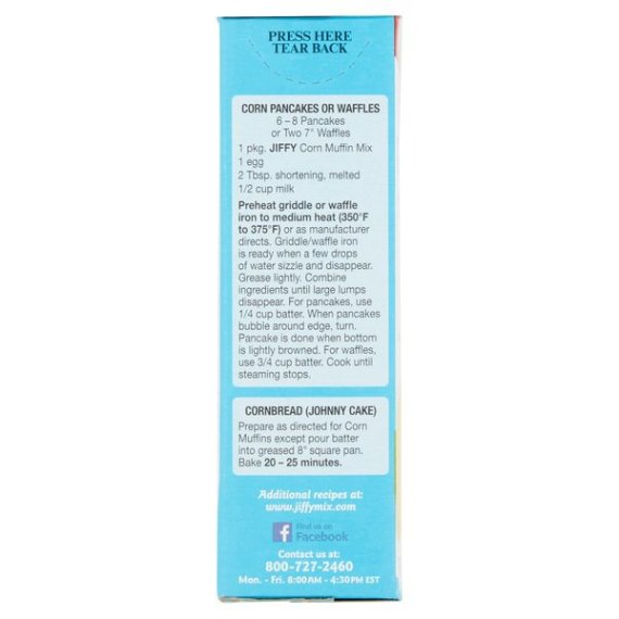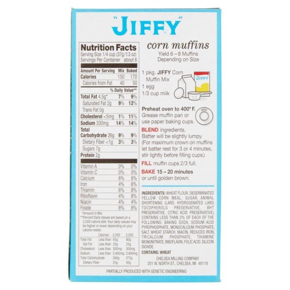 Details Ingredients WHEAT FLOUR, DEGERMINATED YELLOW CORN MEAL, SUGAR, ANIMAL SHORTENING (LARD, HYDROGENATED LARD, TOCOPHEROLS PRESERVATIVE, BHT PRESERVATIVE, CITRIC ACID PRESERVATIVE), CONTAINS LESS THAN 2% OF EACH OF THE FOLLOWING: BAKING SODA, SODIUM ACID PYROPHOSPHATE, MONOCALCIUM PHOSPHATE, SALT, WHEAT STARCH, NIACIN, REDUCED IRON, TRICALCIUM PHOSPHATE, THIAMINE MONONITRATE, RIBOFLAVIN, FOLIC ACID, SILICON DIOXIDE. Show more Product features From a company that has been making excellent muffin and baking mixes since the 1930s, Jiffy Corn Muffin Mix, 8.5 oz, can be used to make delicious muffins, desserts or other tasty meal solutions. This baking mix is easy to make; just add egg and milk to get things started. This product is packaged in recycled paperboard, which is good for the environment. It even includes a convenient recipe on the package which will provide other uses for this mix. Each package contains enough of this blend to make at least six to eight muffins, depending on their size. It contains simple instructions on the back of the box to help make preparation a breeze. Jiffy Corn Muffin Mix, 8.5 oz: Quality and value since 1930 Compare and save Add egg and milk to Jiffy muffin mix Packaged in recycled paperboard Special Features Just add egg And water Net Quantity of Content ABOUT 6 X 1/4 cup