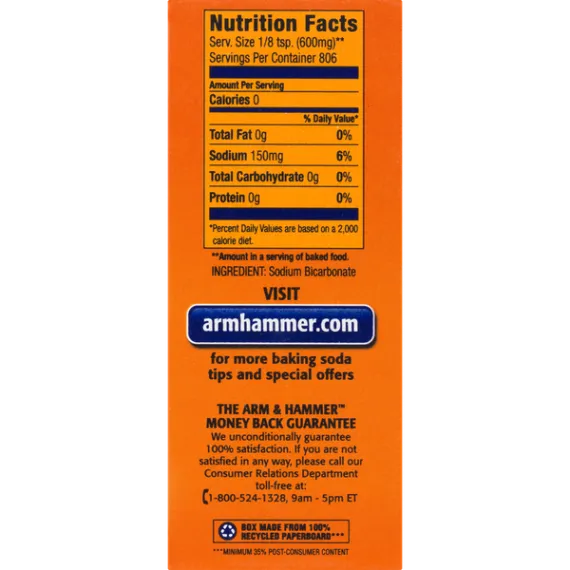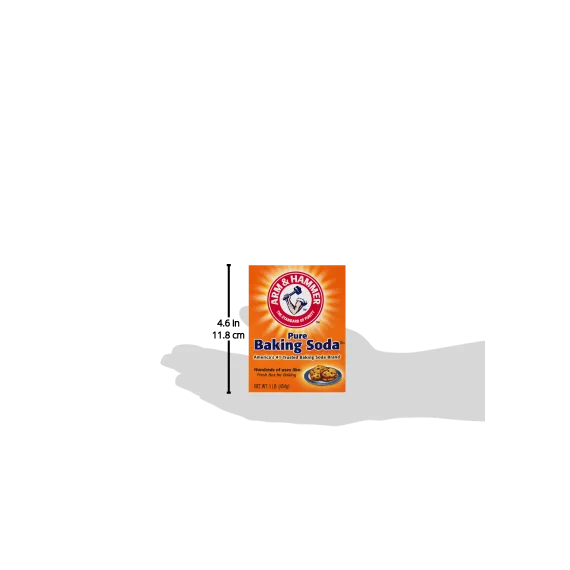 Details Ingredients SODIUM BICARBONATE Product features Arm & Hammer Pure Baking Soda has seemingly endless uses around the home. It contains sodium bicarbonate that naturally absorbs even the toughest odors, such as those found inside footwear and the refrigerator. Since it's scratch-free and contains no harsh chemicals, it also makes a terrific cleaner for pots and pans, countertops and stainless steel appliances. Plus, you can use it to clean your teeth as well as exfoliate and soothe minor skin irritations. This baking soda box is available in a 1 lb size. Arm & Hammer Pure Baking Soda, 1 lb Box: America's #1 trusted baking soda brand Fresh box for baking Contains sodium bicarbonate that naturally absorbs odors Hundreds of uses Natural, safe and effective No harsh chemicals Scratch-free cleaning For baking, cleaning, deodorizing and personal care Arm & Hammer baking soda, 1 lb box Special Features For baking, cleaning & deodorizing Net Quantity of Content 806 X 1/8 tsp
