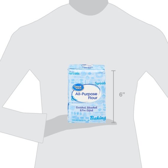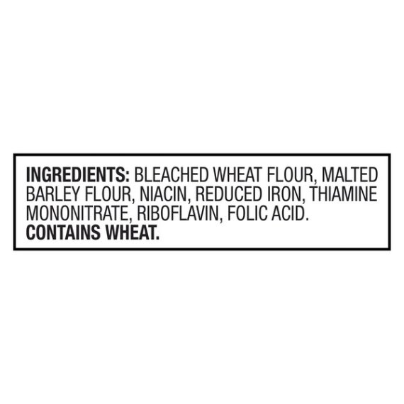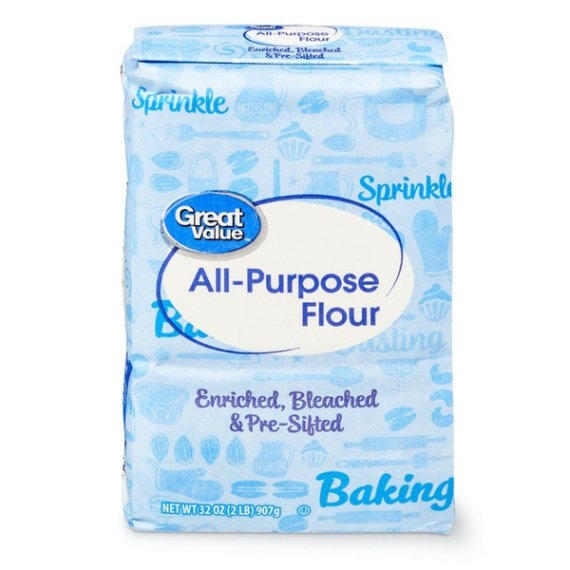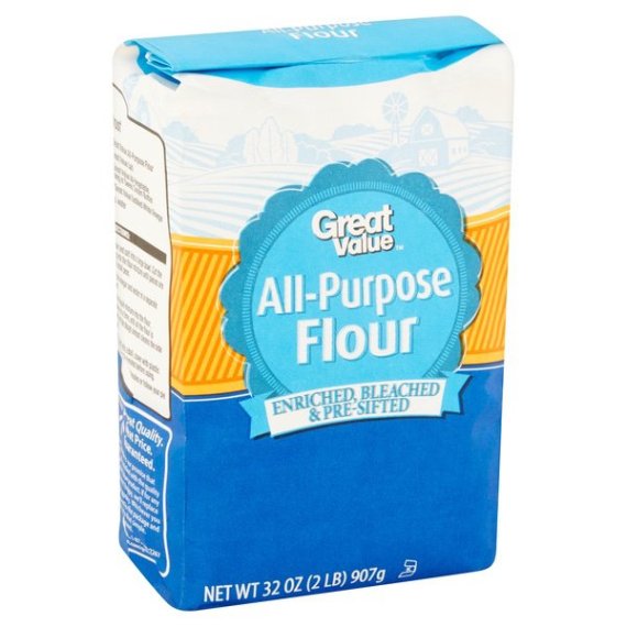 Details Ingredients BLEACHED WHEAT FLOUR, MALTED BARLEY FLOUR, NIACIN, REDUCED IRON, THIAMINE MONONITRATE, RIBOFLAVIN, FOLIC ACID. Product features Great Value All-Purpose Flour is a kitchen essential and is ideal for everyday baking needs. Use it for a wide range of foods, from loaves of bread and muffins to cakes and cookies. This bleached, all-purpose flour is enriched, pre-sifted and ready to use. It's rich in thiamin, folic acid, niacin and riboflavin. There are 110 calories per serving. To ensure freshness, pour an opened bag into an airtight storage container and store it in a cool, dry area of your kitchen pantry. The 32-ounce bag is perfect to fulfill all your baking needs. Bring home Great Value All-Purpose Flour and take your baking to the next level. Great Value products provide families with affordable, high-quality grocery and household consumable options. With our wide range of product categories spanning grocery and household consumables, we offer you a variety of products for your family's needs. Our products are conveniently available online and in Walmart stores nationwide, allowing you to stock up and save money at the same time. Great Value All Purpose Flour, 25 lbs: Bleached, enriched and pre-sifted 110 calories per serving Ideal for baking Convenient 32-oz bag Versatile kitchen essential Net Quantity of Content ABOUT 30 X 1/4 cup