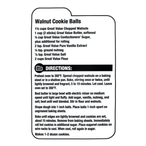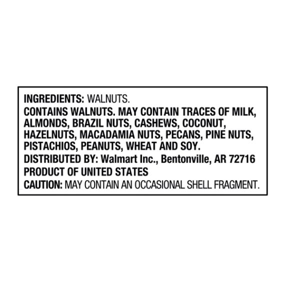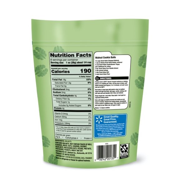 Details    Ingredients  WALNUTS       Product features   Great Value Chopped Walnuts are high-quality walnuts that make for a perfect crunchy and savory snack. They are a rich source of healthy fats and proteins and make an excellent addition to your daily routine. These crunchy walnuts are great for snacking and can also be used to enhance the texture and flavor of your salads and baked goods such as: cakes, pies, and cookies. You can even try making the delicious apple walnut crisp recipe provided right on the bag! They can also be used in your favorite trail mix and are great for topping on cereals, milkshakes and smoothies. Available in a resclosable bag, they are an excellent on-the-go snack. Bring home Great Value Chopped Walnuts today!   Great Value products provide families with affordable, high quality grocery and household consumable options. With our wide range of product categories spanning grocery and household consumables, we offer you a variety of products for your family's needs. Our products are conveniently available online and in Walmart stores nationwide, allowing you to stock up and save money at the same time.      Great Value Chopped Walnuts, 8 oz:     Perfect for snacking and baking   Contains approximately 2 cups   Reclosable bag to maintain freshness   Easy for on-the-go   Use in salads, desserts, smoothies, trail mix, etc.       Net Quantity of Content   8 X 1 oz (28g/about 1/4 cup)