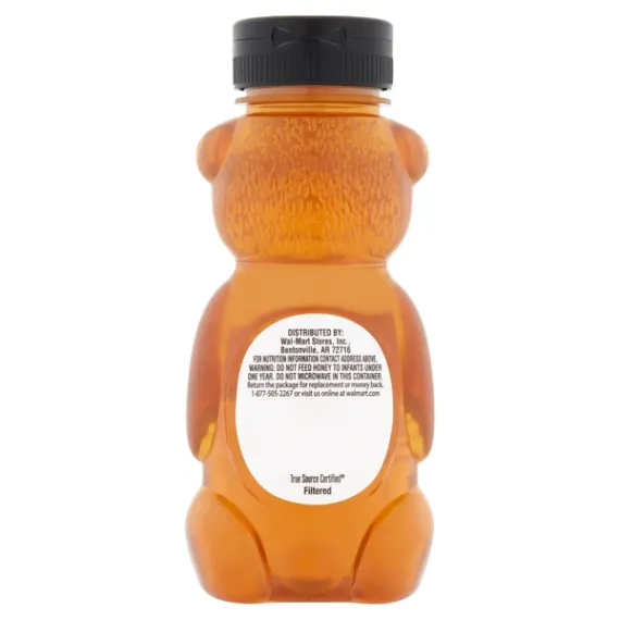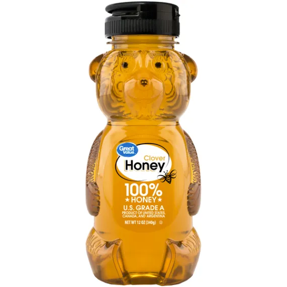 Details Ingredients Filtered Honey Product features Great Value Clover Honey has a pleasant, sweet, flowery flavor that you'll want to incorporate into all your favorite recipes. Its delicate aroma and taste give you the enchanted feeling of being out in the countryside. This clover honey has a soft golden hue and mild flavor that is universally appealing and suitable as a sweetener for everything from your morning tea to a drizzle on your spring salad. Spread it, add it to a sauce, or even use it in a honey mustard dip for crunchy pretzels. Spruce up your toast, cereal, granola, or even a green smoothie with a bit of this delightful, sticky treat. Known as nature's sweetener, this clover honey is so versatile you'll want to keep extra in stock in your pantry. Great Value Clover Honey comes in a cute squeezable, bear-shaped bottle that makes it great for a picnic, travel, camping, or a gift for a friend. Great Value products provide families with affordable, high quality grocery and household consumable options. With our wide range of product categories spanning grocery and household consumables, we offer you a variety of products for your family's needs. Our products are conveniently available online and in Walmart stores nationwide, allowing you to stock up and save money at the same time. U.S. grade A filtered clover honey 12 oz Squeezable, bear-shaped bottle