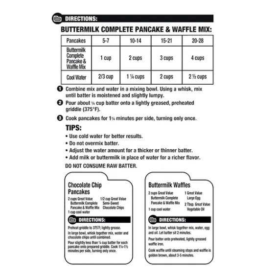 Details Ingredients ENRICHED BLEACHED FLOUR (WHEAT FLOUR, MALTED BARLEY FLOUR, NIACIN, REDUCED IRON, THIAMINE MONONITRATE, RIBOFLAVIN, FOLIC ACID), SUGAR, LEAVENING (BAKING SODA, SODIUM ALUMINUM PHOSPHATE, MONOCALCIUM PHOSPHATE), DEXTROSE, SOYBEAN OIL, SALT, BUTTERMILK POWDER, DRIED EGG WHITES, EGG YOLK POWDER, NATURAL FLAVOR. CONTAINS MILK, EGGS AND WHEAT. Show more Product features Great Value Complete Buttermilk Pancake and Waffle Mix delivers a nostalgic homemade aroma and taste right to your home kitchen. Serve up a pan full of happiness when you cook up crispy, golden waffles in your waffle maker or make light and bouncy pancakes in your stovetop and experience the buttermilk flavor you love in every bite. Whip up a fresh pancake dressed with butter and serve alongside warm maple syrup, or make an enticing waffle with a dollop of whipped cream and serve alongside a dish of warm fruit syrup for an extra sweet treat. Give yourself the quick and delicious homemade breakfast you deserve and bring home a box of Great Value Complete Buttermilk Pancake and Waffle Mix. Great Value products provide families with affordable, high-quality grocery and household consumable options. With our wide range of product categories spanning grocery and household consumables, we offer you a variety of products for your family's needs. Our products are conveniently available online and in Walmart stores nationwide, allowing you to stock up and save money at the same time. Great Value Complete Pancake & Waffle Mix, Buttermilk, 32 oz: Makes light and fluffy pancakes and crisp, golden waffles Delicious buttermilk flavor Easy no-mess preparation; just add water to the mix and start cooking Perfect for breakfast, lunch, dinner, and dessert Kosher No trans fat Special Features Just add water Net Quantity of Content 15 X 0.5 cup