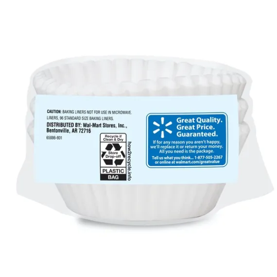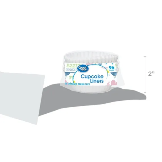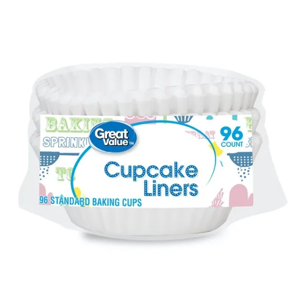 Details Product features Perfect your rich and delicious cupcakes with Great Value Cupcake Liners. Great for cupcakes, muffins, small cheesecakes, and chocolate truffles, these cupcake liners are made with easy-release paper that let you enjoy every bite of your favorite sweet treat. For easy clean-up and a ready-to-go presentation, simply place a liner in each of the cups of your cupcake pan, pour the batter in, and bake! With 96 white-colored cupcake liners per pack, they not only save you tons of cleanup time but they also provide you with aesthetically appealing cupcakes and muffins. Bake the most delicious and great-looking treats with Great Value Cupcake Liners. Great Value products provide families with affordable, high-quality grocery and household consumable options. With our wide range of product categories spanning grocery and household consumables, we offer you a variety of products for your family's needs. Our products are conveniently available online and in Walmart stores nationwide, allowing you to stock up and save money at the same time. Great Value Cupcake Liners, White, 96 Count: Great for making delicious cupcakes Saves cleanup time Provides an aesthetic appeal to your homemade treats Perfect for muffins, small cheesecakes, chocolate truffles, and more Standard baking cups