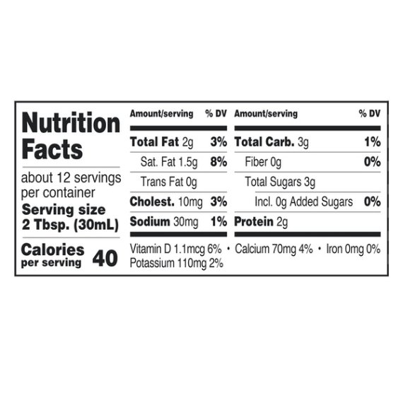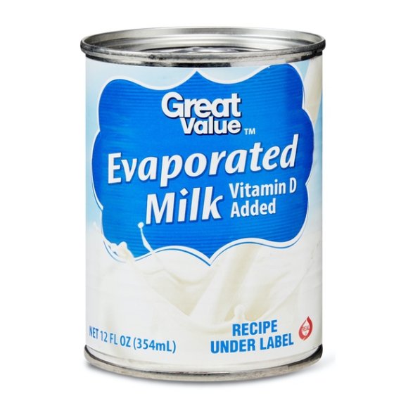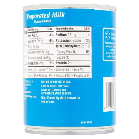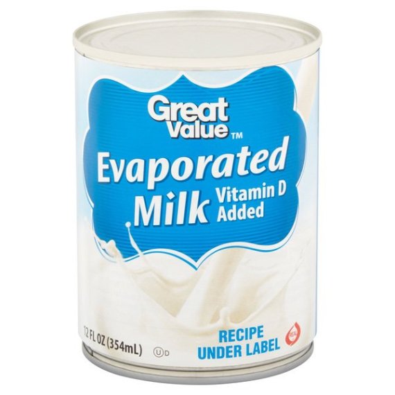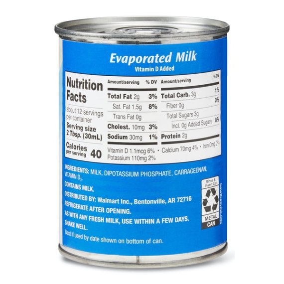 Details    Ingredients  MILK, DIPOTASSIUM PHOSPHATE, CARRAGEENAN, VITAMIN D3.       Product features  Evaporated Milk   Great Value Evaporated Milk:   Milk, Vitamin D3   Vitamin D added   No artificial flavors or colors   Kosher dairy   Great Value Evaporated Milk is perfect for baking, cooking and making beverages. This evaporated milk provides a rich flavorful addition to your recipes, plus it's enriched with vitamin D. No artificial flavors or colors are added to this evaporated milk.      Special Features  40 calories per serving    Net Quantity of Content   ABOUT 12 X 2 Tbsp
