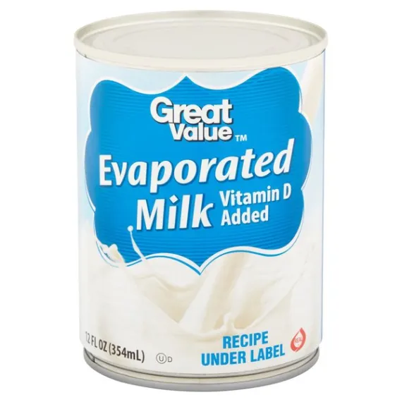 Details Ingredients MILK, DIPOTASSIUM PHOSPHATE, CARRAGEENAN, VITAMIN D3. Product features Evaporated Milk Great Value Evaporated Milk: Milk, Vitamin D3 Vitamin D added No artificial flavors or colors Kosher dairy Great Value Evaporated Milk is perfect for baking, cooking and making beverages. This evaporated milk provides a rich flavorful addition to your recipes, plus it's enriched with vitamin D. No artificial flavors or colors are added to this evaporated milk. Special Features 40 calories per serving Net Quantity of Content ABOUT 12 X 2 Tbsp