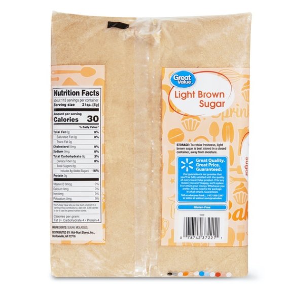 Details    Ingredients  SUGAR, CORNSTARCH       Product features   Add a little sweetness to your day with Great Value Light Brown Sugar. Perfect for all of your baking needs, Great Value Light Brown Sugar is a staple in cookies, brownies, pies, and cakes. Brown sugar will help a sugar cookie spread thin while keeping an oatmeal cookie plump and chewy, and will add a depth of flavor to your favorite gingersnap recipe. For a bit of a twist, use brown sugar in stir fries, make a sweet and spicy rub or marinade for meat or poultry, or use brown sugar with some butter to glaze vegetables like carrots, parsnips, and onions. Pick up some Great Value Light Brown Sugar for your pantry today.    Great Value products provide families with affordable, high-quality grocery and household consumable options. With our wide range of product categories spanning grocery and household consumables, we offer you a variety of products for your family's needs. Our products are conveniently available online and in Walmart stores nationwide, allowing you to stock up and save money at the same time.      Great Value Light Brown Sugar, 32 oz:     Perfect for all of your baking needs   A staple in cookie, brownie, pie, and cake recipes   Use it to make an unexpected sweet and spicy rub or marinade for meat or poultry   30 calories per serving       Net Quantity of Content   227 X 4 g