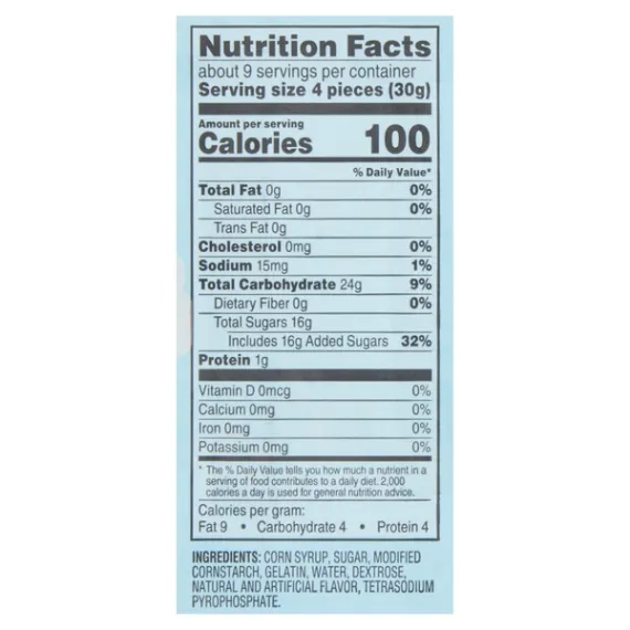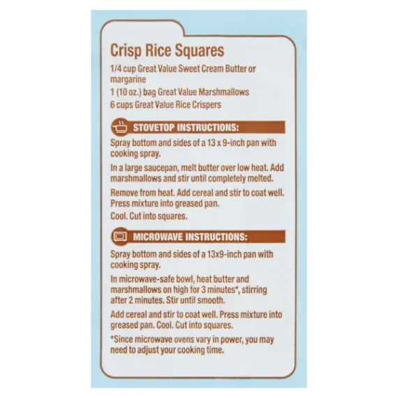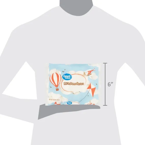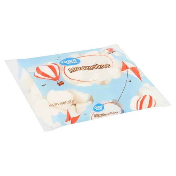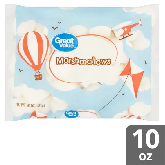 Details Ingredients CORN SYRUP, SUGAR, DEXTROSE, MODIFIED FOOD STARCH (CORN), WATER, GELATIN, NATURAL AND ARTIFICIAL FLAVOR, TETRASODIUM PYROPHOSPHATE. Show more Product features Great Value Marshmallows are a sweet snack and perfect for roasting up over a campfire. These marshmallows have a creamy and smooth texture that will make for great baking or dipping in caramel and chocolate sauces. Great Value Marshmallows are also perfect to use in crispy rice squares, which are quick and easy to make so you can enjoy them with your family at home or bring them to share at a party with friends. Try adding these marshmallows to your next cup of hot cocoa or holiday sweet potato casserole. Or, create a fun cookie, muffin, or brownie with a gooey marshmallow surprise. Since they're 100 calories per serving, contain 0 grams of trans fat, and are gluten-free, these marshmallows are the perfect sweet treat when you want something small. Great Value Marshmallows are a wonderful product to keep in the pantry for a quick snack or a special addition to your baking any day of the week. Great Value products provide families with affordable, high quality grocery and household consumable options. With our wide range of product categories spanning grocery and household consumables, we offer you a variety of products for your family's needs. Our products are conveniently available online and in Walmart stores nationwide, allowing you to stock up and save money at the same time. Marshmallows 10oz package Gluten-free 100 calories per serving Special Features No artificial colors Net Quantity of Content ABOUT 9 X 30 g