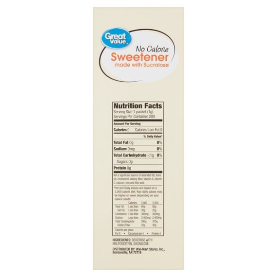Details Ingredients DEXTROSE WITH MALTODEXTRIN, SUCRALOSE. Product features Savor your sweet moments with Great Value No Calorie Sweetener. Sucralose is one of the most popular artificial sweeteners and has been used to substitute sugar for many years. It has a sweet flavor, similar to sugar, without any of the calories. Your steaming hot coffee or iced tea can be as sweet as you like, guilt-free, without any added calories or the dangerous chemicals included in other artificial sweeteners. This package features a sucralose sweetener to sugar conversion chart, so you always know just how many packets to add. Toss a few of these pre-measured packets into your bag or car for a bit of extra sweetness on the go. You can also try this no-calorie sweetener on fruit or cereal for an extra sweet treat. When you use Great Value No Calorie Sweetener your sweet tooth and your waistline will thank you. Great Value products provide families with affordable, high quality grocery and household consumable options. With our wide range of product categories spanning grocery and household consumables, we offer you a variety of products for your family's needs. Our products are conveniently available online and in Walmart stores nationwide, allowing you to stock up and save money at the same time. Great Value No Calorie Sweetener, 200 count, 7 oz: Zero calories Zero sodium Tastes like sugar 1 packet equals 2 teaspoons of sugar Made with sucralose 200 packets Net weight 7oz Special Features Great for hot And cold beverages Net Quantity of Content 200 X 1 g