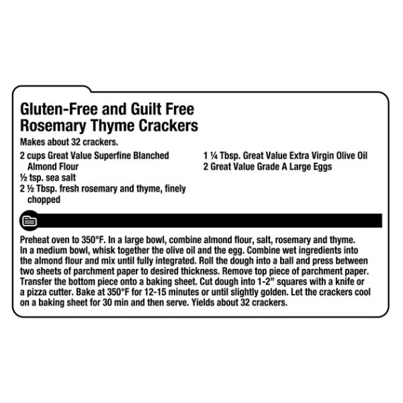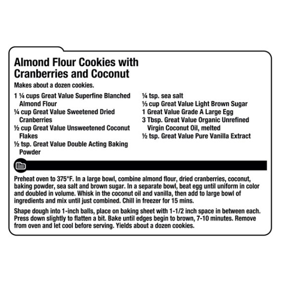Details    Ingredients  BLANCHED ALMOND FLOUR.       Product features   Great Value Superfine Blanched Almond Flour is perfect for use in your gluten-free baking. This superfine blanched almond flour comes in a reclosable bag to help maintain freshness, and for optimal freshness, seal the bag after each use and store in the refrigerator or freezer. This bag contains two pounds of almond flour which ensures there will be plenty of flour to have at your disposal for when you’re testing out all your new recipes. Use this almond meal as a flour substitute in some of your favorite gluten-free baking classics like low-carb crackers, cookies and more. It is low in sugar and contains three grams of protein per two-tablespoon serving. For a health-conscious spin on your favorite recipes, try Great Value Superfine Blanched Almond Flour.    Great Value products provide families with affordable, high-quality grocery and household consumable options. With our wide range of product categories spanning grocery and household consumables, we offer you a variety of products for your family's needs. Our products are conveniently available online and in Walmart stores nationwide, allowing you to stock up and save money at the same time.      Great Value Superfine Blanched Almond Flour, 2 lbs:     Perfect choice for gluten-free baking   Reclosable bag maintains freshness for longer   Low in sugar and contains three grams of protein per two-tablespoon serving   60 servings per container   For optimal freshness, seal the bag after each use and store in the refrigerator or freezer       Net Quantity of Content   60 X 2 Tbsp