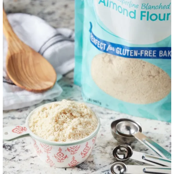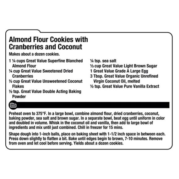 Details Ingredients BLANCHED ALMOND FLOUR. Product features Great Value Superfine Blanched Almond Flour is perfect for use in your gluten-free baking. This superfine blanched almond flour comes in a reclosable bag to help maintain freshness, and for optimal freshness, seal the bag after each use and store in the refrigerator or freezer. This bag contains two pounds of almond flour which ensures there will be plenty of flour to have at your disposal for when you’re testing out all your new recipes. Use this almond meal as a flour substitute in some of your favorite gluten-free baking classics like low-carb crackers, cookies and more. It is low in sugar and contains three grams of protein per two-tablespoon serving. For a health-conscious spin on your favorite recipes, try Great Value Superfine Blanched Almond Flour. Great Value products provide families with affordable, high-quality grocery and household consumable options. With our wide range of product categories spanning grocery and household consumables, we offer you a variety of products for your family's needs. Our products are conveniently available online and in Walmart stores nationwide, allowing you to stock up and save money at the same time. Great Value Superfine Blanched Almond Flour, 2 lbs: Perfect choice for gluten-free baking Reclosable bag maintains freshness for longer Low in sugar and contains three grams of protein per two-tablespoon serving 60 servings per container For optimal freshness, seal the bag after each use and store in the refrigerator or freezer Net Quantity of Content 60 X 2 Tbsp