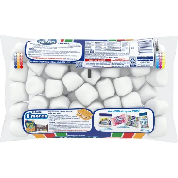 Details Ingredients Ingredients: Corn Syrup, Sugar, Dextrose, Modified Cornstarch, Water, Contains Less Than 2% Of Gelatin, Tetrasodium Pyrophosphate (Whipping Aid), Natural And Artificial Flavor, Blue 1. Show more Product features Jet-Puffed Marshmallows are a delicious and versatile dessert topping. These classic marshmallows deliver the sweet taste and fluffy texture you know and love. With 0 grams of trans fat and 0 grams of total fat per serving, marshmallows make a fun snack for kids or a mouthwatering addition to your favorite dessert recipes. Use fluffy marshmallows to make rice cereal treats, or add marshmallows to your hot chocolate. Perfect for camping trips, try putting toasted campfire marshmallows and chocolate on graham crackers to make s'mores. The marshmallows come packaged in a sealed 12 ounce bag for lasting freshness until you're ready to enjoy. One 12 oz. bag of Jet-Puffed Marshmallows Jet-Puffed Marshmallows are a delicious and versatile dessert topping Classic marshmallows deliver the sweet taste and fluffy texture you know and love Fat free snack contains 0 grams of trans fat and 0 grams of total fat per serving Toasted marshmallows are perfect for s'mores, or try using marshmallows for hot chocolate Use these marshmallows to make a classic rice cereal treat Packaged in a sealed bag for lasting freshness until you're ready to enjoy Net Quantity of Content 12.0 X 4 pieces (29g)
