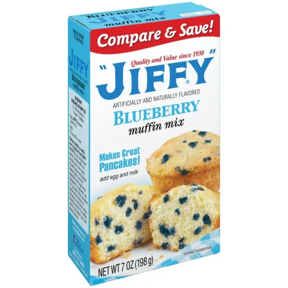 Details Ingredients WHEAT FLOUR, SUGAR, ANIMAL SHORTENING (LARD, HYDROGENATED LARD, TOCOPHEROLS PRESERVATIVE, BHT PRESERVATIVE, CITRIC ACID PRESERVATIVE), DEXTROSE, CONTAINS LESS THAN 2% OF EACH OF THE FOLLOWING: SALT, BAKING SODA, PALM OIL, SODIUM ALUMINUM PHOSPHATE, MONOCALCIUM PHOSPHATE, FRUCTOSE, FOOD STARCH-MODIFIED, NATURAL AND ARTIFICIAL FLAVORS, TRICALCIUM PHOSPHATE, CITRIC ACID, BLUE 2 LAKE, RED 40 LAKE, WHEAT STARCH, NIACIN, REDUCED IRON, THIAMINE MONONITRATE, RIBOFLAVIN, FOLIC ACID, SILICON DIOXIDE. Show more Product features This 7-oz box of Jiffy Blueberry Muffin Mix is an essential part of any pantry. You can use it to make all sorts of food, including pancakes and waffles. This "just-add-milk" muffin mix is easy to prepare so you can get food on the table quickly. There are recipes on the box to inspire your creativity. This product is useful for breakfast, brunch, dessert and more. It comes in a package that's made from recycled material, which makes it an eco-friendly option for your home. Jiffy: Blueberry Muffin Mix, 7 Oz: Quality and value since 1930 Compare and save Add egg and milk Packaged in recycled paperboard 7 oz of Jiffy muffin mix per box Also makes delicious pancakes Recipes on box 190 calories per serving No trans fat Good source of thiamin, riboflavin and folate Easy to prepare Special Features Just add egg And milk Net Quantity of Content about 5, 1.4 OZ X 0.25 cup