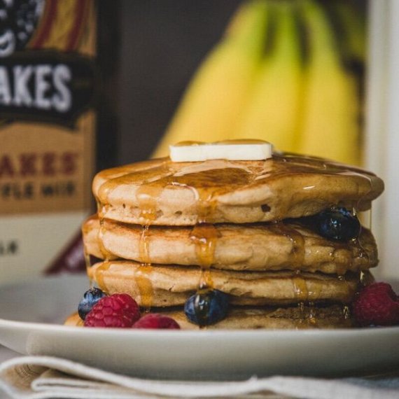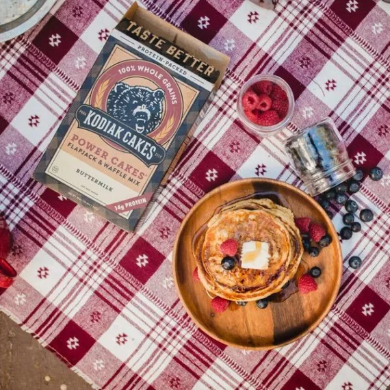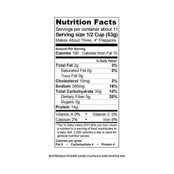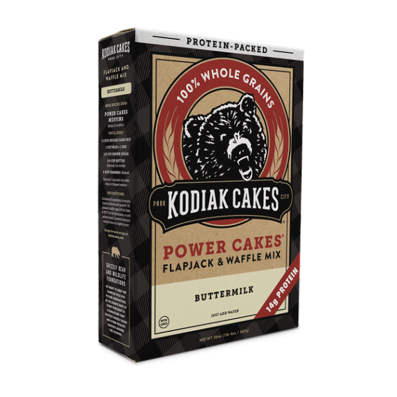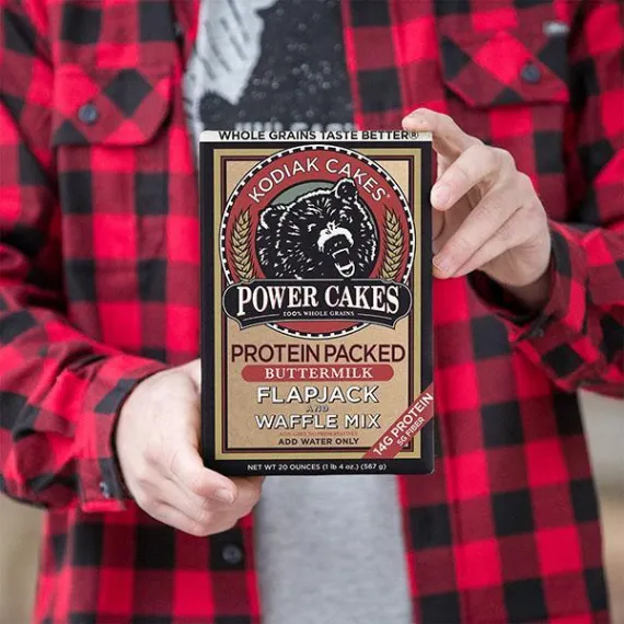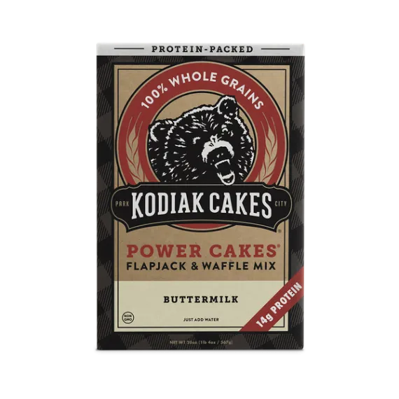Details Ingredients 100% Whole Grain Wheat Flour, 100% Whole Grain Oat Flour, Protein Blend (Wheat Protein Isolate, Whey Protein Concentrate, Milk Protein Isolate), Non-Fat Sweet Cream Buttermilk Powder, Brown Sugar, Baking Powder (Monocalcium Phosphate, Sodium Bicarbonate), Sea Salt. Show more Product features With Kodiak Cakes, we set out to restore the flapjack tradition. The old recipe could not be compromised–inexpensive fillers such as bleached flour, white sugar, and artificial additives were out of the question. Now with Power Cakes you get the amazing taste of Kodiak Cakes but with added protein to help you power up. Our Power Cakes mix is naturally crafted with nutrients from 100% whole-grain wheat and oat flours, high-quality protein, and sweet buttermilk for a delicious taste that is low in sugar and high in nutrition. Just add water or milk for a protein-packed breakfast in minutes. Kodiak Power Cakes offer a protein-packed, delicious boost needed to power through your day. Don't sugar crash; power up with Kodiak Power Cakes. Kodiak Cakes Power Cakes, Buttermilk Flapjack and Waffle Mix, 20 Oz Made with 100% whole grains for a solid start to your day 14 grams of high-quality protein per serving to keep you full and energized for your day A sweet buttermilk taste the entire family will love Non-GMO ingredients and no artificial preservatives 11 servings per box Add water or milk for an easy and delicious breakfast Use for flapjacks, waffles, pancakes, or Belgian waffle recipes All natural with no added fat, cholesterol or sugar Think Outside the Box with Pizza Waffles (Recipe makes 4 servings with 1 4-inch waffle per serving) Ingredients: 1-1/2 cup Kodiak Cakes Buttermilk Power Cakes Flapjack and Waffle Mix 1 1/2 tablespoon oil 1-1/2 cup cold water 8 slices provolone cheese (sliced thin) Pizza meat (prosciutto, thinly-sliced ham, pepperoni, etc.) 1/2 cup jarred low-sugar pizza sauce + more for dipping 1-1/2 tablespoon oil Instructions: Preheat waffle iron. In a large mixing bowl, mix together Kodiak Cakes mix and water. When waffle iron is hot, spray with a generous amount of non-stick spray. Spoon about 1/4 cup batter onto it. Smooth around, then place meat, 2 slices of cheese and a large spoonful of pizza sauce on top. Add an additional 1/8 cup batter on top of the toppings, quickly smooth with a spoon and close the waffle iron lid. Bake until crispy and golden brown. Carefully remove from waffle iron and serve with extra pizza sauce to dip in. Our Mission to Restoring the Real Food Tradition: Whole Grains Taste Better: Apart from being the essential ingredient of the original frontier flapjacks, we use whole grains because they just taste better. They’re also packed with the fiber, protein, vitamins, and minerals essential to fueling an active life. So instead of processing our wheat and “enriching” it with some of its original nutritional value, we left it as is—free of GMOs, preservatives, or artificial additives. Powered by Protein: Combining the nourishment of whole grains with the benefits of high-quality protein just makes sense to us, so we add high-quality protein to many of our products and give you the ability to incorporate even more protein in your diet by adding milk and an egg. Plus, you won’t have to suffer through another chalky protein breakfast shake again. You’re welcome. Fuel for Conquering Your Frontier: Whether you’re training for your first half-marathon, prepping for a big day on the trail, or just adopting a healthier diet, the need for real, nourishing food remains the same. We’ve taken care to craft our foods with the wholesome nutrients, freshly ground whole grains, and essential protein you need to conquer your frontier. Net Quantity of Content 11 X 1/2 Cup