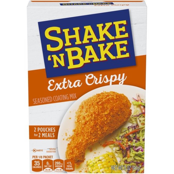 Details Ingredients Ingredients: Enriched Wheat Flour (Wheat Flour, Niacin, Reduced Iron, Thiamin Mononitrate [Vitamin B1], Riboflavin [Vitamin B2], Folic Acid), Salt, Canola Oil, Sugar, Monosodium Glutamate, Contains Less Than 2% Of Dextrose, Cornmeal, Paprika, Hydrolyzed Corn Protein, High Fructose Corn Syrup, Yeast, Spice, Dried Onions, Dried Garlic, Corn Maltodextrin, Caramel Color, Citric Acid, Extractives Of Paprika (Color) Show more Product features Kraft Shake 'N Bake Extra Crispy Seasoned Coating Mix adds a crispy crust to your chicken without the mess of frying for a quick home-style meal. This crispy coating is perfectly seasoned with savory flavors for a delicious, irresistible crunch. For simple prep, moisten the chicken, shake it in the coating and bake it until it's fully cooked. Use it with bone-in or boneless chicken to make crispy baked chicken, a crispy chicken sandwich or easy chicken nuggets. Each 5 ounce box contains two pouches of chicken coating, so you can enjoy more than one family dinner over oven baked crispy chicken. This extra-crispy chicken seasoning is all you need to take your home-style chicken from good to incredible. One 5 Ounce. box of Kraft Shake 'N Bake Extra Crispy Seasoned Coating Mix Kraft Shake 'N Bake Extra Crispy Seasoned Coating Mix creates crispy chicken without frying Add classic savory flavor to your chicken with perfectly seasoned coating mix Ideal for chicken nuggets, crispy chicken sandwiches, chicken Parmesan and other dishes Packaged in two pouches for more than one meal Net Quantity of Content 16.0 X 1/8 packet (9g)