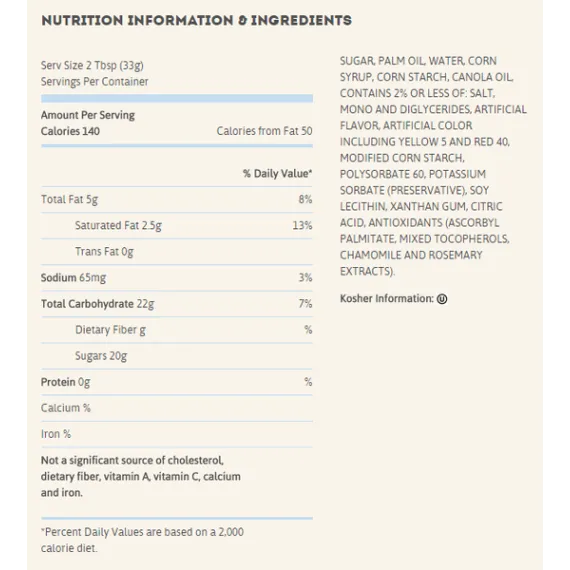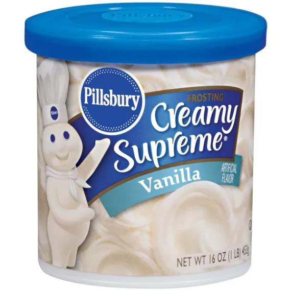 Details Ingredients SUGAR, PALM OIL, WATER, CORN SYRUP, CORN STARCH, CANOLA OIL, CONTAINS 2% OR LESS OF: SALT, MONO AND DIGLYCERIDES, ARTIFICIAL FLAVOR, ARTIFICIAL COLOR INCLUDING YELLOW 5 AND RED 40, POLYSORBATE 60, MODIFIED CORN STARCH, POTASSIUM SORBATE (PRESERVATIVE), SOY LECITHIN, XANTHAN GUM, CITRIC ACID, ANTIOXIDANTS (ASCORBYL PALMITATE, MIXED TOCOPHEROLS, CHAMOMILE AND ROSEMARY EXTRACTS). Show more Product features The Pillsbury Creamy Supreme Vanilla Frosting can give your desserts a fresh taste. It is made with a blend of sugar, partially hydrogenated vegetable oil and water. The creamy frosting comes in a 16 oz size for your convenience. Sugar, partially hydrogenated vegetable oil, water. Pillsbury frosting is kosher. Warnings: Contains soybean ingredients. Ingredients: Sugar, Partially Hydrogenated Vegetable Oil (Soybean and Cottonseed Oil), Water, Corn Syrup, Corn Starch, Contains 2% Or Less of Each of The Following: Salt, Mono- and Diglycerides, Color Added Including Yellow 5 and Red 40, Artificial Flavor, Modified Corn Starch, Polysorbate 60, Potassium Sorbate (Preservative), Soy Lecithin, Citric Acid. Instructions: For Easy Spreading, Use Frosting At Room Temperature. Stir Frosting In Can Before Using. Spread On Cooled Cake. Pillsbury Creamy Supreme Frosting, Vanilla, 16 Oz Net Quantity of Content ABOUT 14 X 2 Tbsp