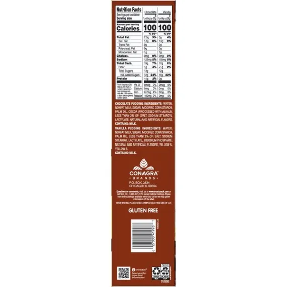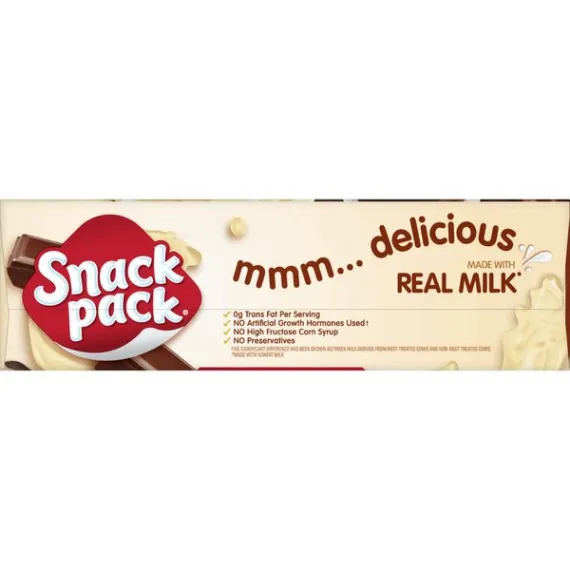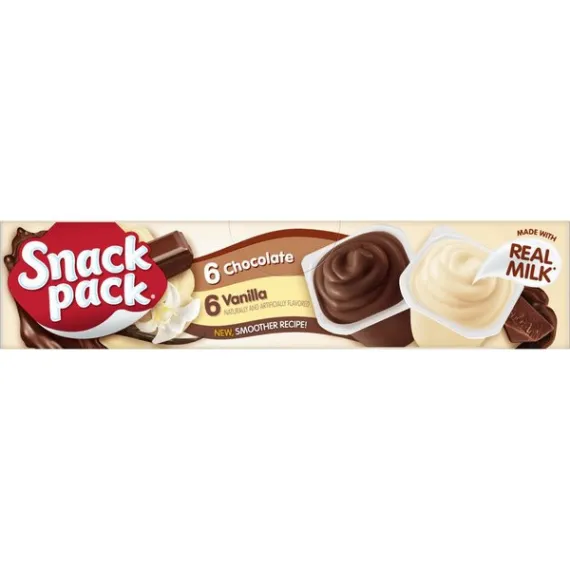 Details Ingredients CHOCOLATE PUDDING INGREDIENTS: Water, Nonfat Milk, Sugar, Modified Corn Starch, Palm Oil, Cocoa (Processed with Alkali), Less than 2% of: Salt, Sodium Stearoyl Lactylate, Natural and Artificial Flavors. CONTAINS: MILK Show more Product features Give your kids a delicious treat with the Snack Pack Chocolate and Vanilla Pudding Cups Family Pack. Snack Pack Pudding Cups have all of the creamy goodness you could want in a snack and are sure to bring a smile to snack time. Creamy, delicious Snack Pack pudding is made with real milk and no high-fructose corn syrup for a sweet snack. Take your sack lunch to the next level with this awesome dessert that's perfect for on-the-go snacking. Both Chocolate and Vanilla Snack Pack Pudding Cups have 100 calories with no preservatives and zero grams trans fat per 3.25 oz serving. Each pack contains 6 Chocolate and 6 Vanilla Pudding Cups. Give your kids a treat with Snack Pack Chocolate and Vanilla Pudding Cups Family PackSnack Pack Pudding Cups are all of the creamy goodness you could want in a snack and are sure to bring a smile to snack timeCreamy, delicious Snack Pack pudding is made with real milk and no high-fructose corn syrup for a sweet snackTake your sack lunch to the next level with this awesome dessert that's perfect for on-the-go snackingBoth Snack Pack Chocolate and Vanilla Pudding Cups have 100 calories with no preservatives and zero grams trans fat per 3.25 oz serving. Each pack contains 6 Chocolate and 6 Vanilla Pudding Cups. No artificial growth hormones used.* (*No significant difference has been shown between milk derived from rBST-treated cows and non-rBST treated cows.)Perfect after-school snack100 calories per serving Net Quantity of Content 6.0 X 92g
