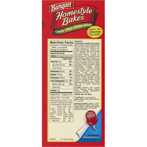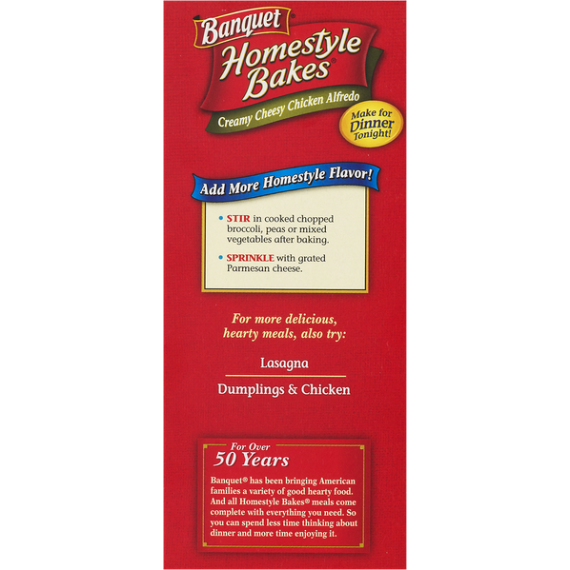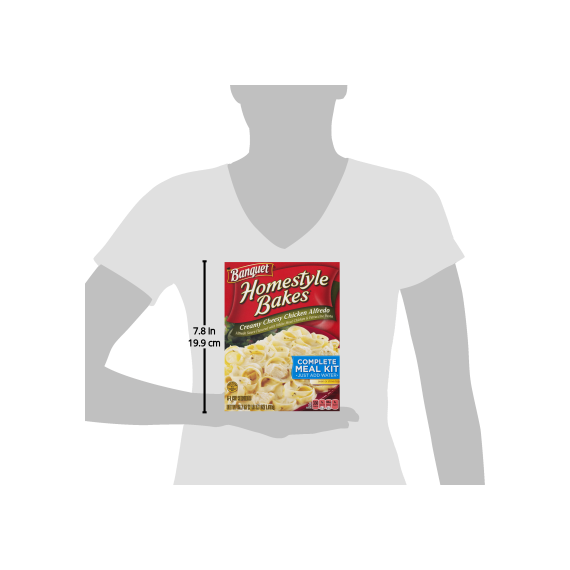 Details Ingredients ALFREDO SAUCE WITH CHICKEN: Chicken Broth, Turkey Broth, Diced Chicken (Chicken Breast With Rib Meat, Water, Modified Rice Starch, Isolated Soy Protein, Salt, Sodium Phosphates), Soybean Oil, Butter, Modified Corn Starch, Nonfat Dry Milk, Contains 2% Or Less Of: Buttermilk Powder, Chicken Fat, Maltodextrin, Salt, Parmesan Cheese (Pasteurized Part-Skim Cow?s Milk, Cheese Culture, Salt, Enzymes), Romano Cheese (Pasteurized Cow's Milk, Salt, Cheese Cultures, Enzymes), Whey, Sugar, Cream, Monosodium Glutamate, Sodium Phosphate, Natural Flavors, Titanium Dioxide (Color), DATEM, Sodium Stearoyl Lactylate, Lactic Acid, Citric Acid, Disodium Guanylate, Disodium Inosinate, Milk Powder, Parsley, Autolyzed Yeast Extract, Cooked Chicken, Sodium Caseinate, Turkey Meat, Mushroom Powder, Natural Chicken Flavor, Turkey Fat. FETTUCINE: Enriched Pasta (Durum Wheat Semolina, Niacin, Ferrous Sulfate (Iron), Thiamine Mononitrate, Riboflavin, Folic Acid). CONTAINS: SOY, MILK, WHEAT. Show more Product features Put together a tasty meal for your family in minutes with Banquet Homestyle Bakes Creamy Cheesy Chicken Alfredo Meal Kit. You and the family will love the deliciously creamy and cheesy taste of this Italian favorite, a complete meal in a box. Made with wholesome ingredients, Banquet's wide selection of homestyle meals will please everyone in your family. Treat your family to a delicious meal tonight with five servings, each with 330 calories, 13g protein, and 0g trans fat. Banquet serves up honest, wholesome microwave meals, bringing more value to your table with large portions and quality ingredients. This pack contains one 35.7 Ounce box of Banquet Homestyle Bakes Creamy Cheesy Chicken Alfredo Meal Kit. This pack contains one 35.7 Ounce box of Banquet Homestyle Bakes Creamy Cheesy Chicken Alfredo Meal Kit With everything you need to make a hot meal worth remembering, Homestyle Bakes will get your family running to the dinner table You and the family will love the deliciously creamy and cheesy taste of this Italian favorite, a complete meal in a box Made with wholesome ingredients, Banquet's wide selection of homestyle meals will please everyone in your family Treat your family to a delicious meal tonight with five servings, each with 330 calories, 13g, protein and 0g trans fat Net Quantity of Content 5.0 X 202g