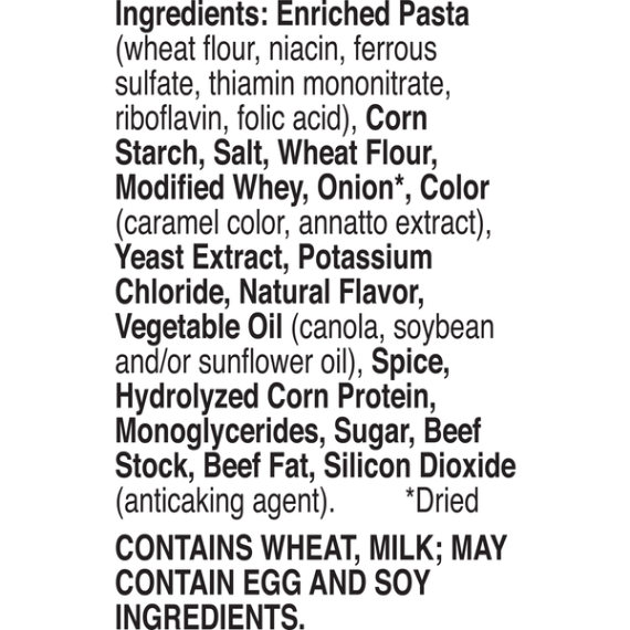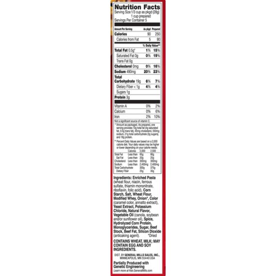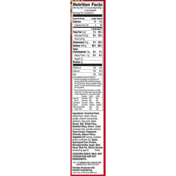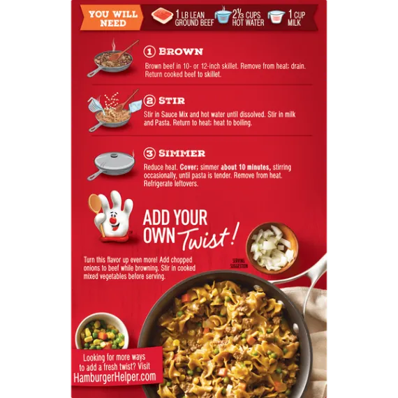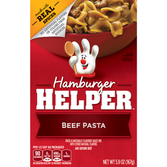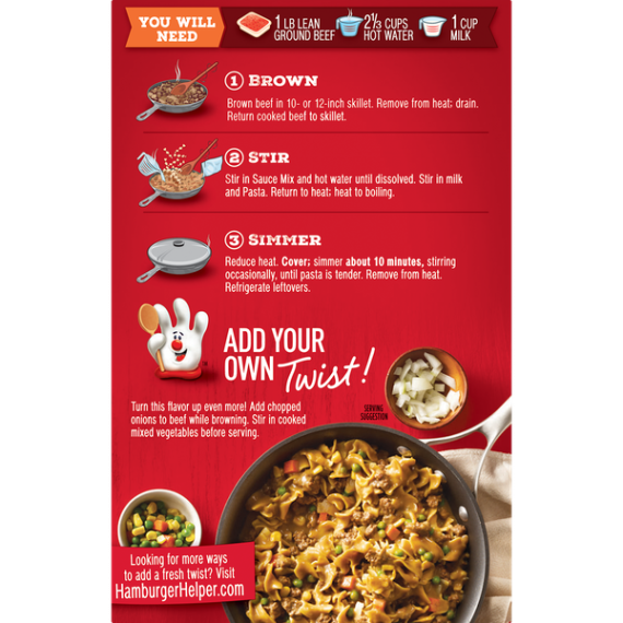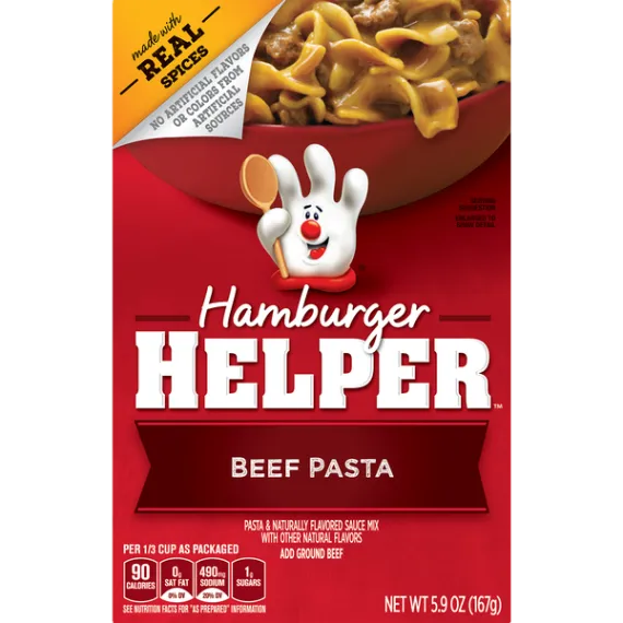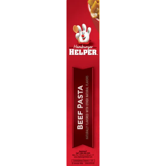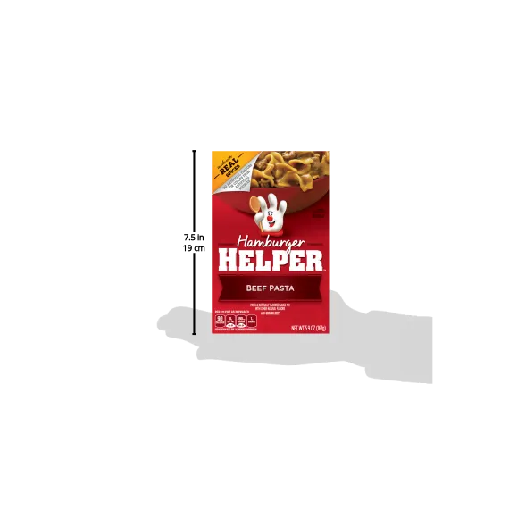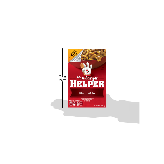 Details Ingredients Enriched Pasta (Wheat Flour, Niacin, Ferrous Sulfate, Thiamin Mononitrate, Riboflavin, Folic Acid), Corn Starch, Salt, Wheat Flour, Modified Whey, Onion*, Color (Caramel Color, Annatto Extract), Hydrolyzed Corn Protein, Potassium Chloride, Yeast Extract, Natural Flavor, Vegetable Oil (Canola, Soybean and/or Sunflower Oil), Spice, Monoglycerides, Soy Sauce* (Soybeans, Wheat, Salt), Mushroom*, Hydrolyzed Soy and Wheat Protein, Sugar, Garlic*, Soybean Oil, Silicon Dioxide (Anticaking Agent).*Dried. Show more Product features Beef Pasta Hamburger Helper is made with REAL spices for the flavors you love most. Our products are made with NO artificial flavors or colors from artificial sources. Add Your Own Twist! Turn this flavor up even more! Add chopped onions to beef just before simmering. Stir in cooked mixed vegetables before serving. DRY MEAL MIX: America's favorite Hamburger Helper in a delicious beef pasta entrée, blending pasta, sauce and real spices INGREDIENTS: Packaged food is made with real spices and no artificial flavors or colors from artificial sources QUICK AND EASY: Make Hamburger Helper in three easy steps; simply brown beef, stir in ingredients and pasta sauce and simmer ENDLESS OPTIONS: Add your own twist with additional ingredients and head to the Betty Crocker website for Hamburger Helper recipes and pastas the whole family will love BOX CONTAINS: One pack of Hamburger Helper meals, 5.9 oz box; an everyday pantry staple Meal Kit, Dry Dinner Kit, One Skillet Meal, Helpers, Hamburger Helper, Packaged Meal Net Quantity of Content 5 X 1 cup prepared