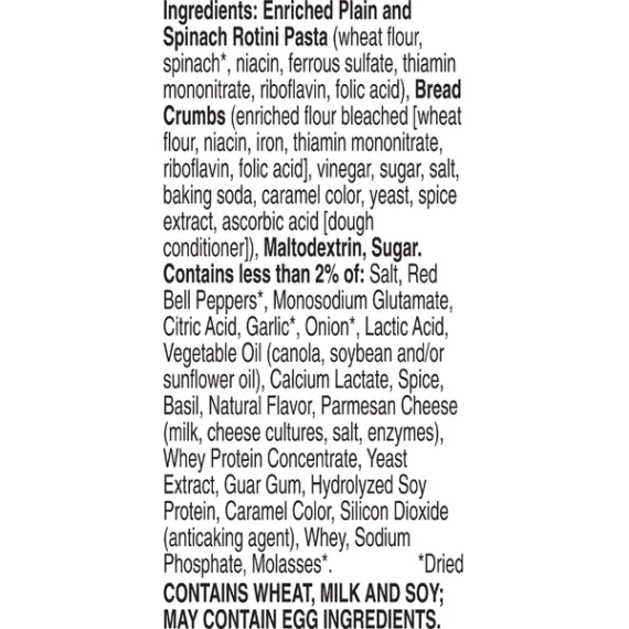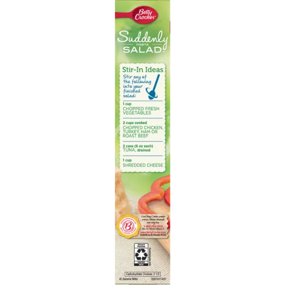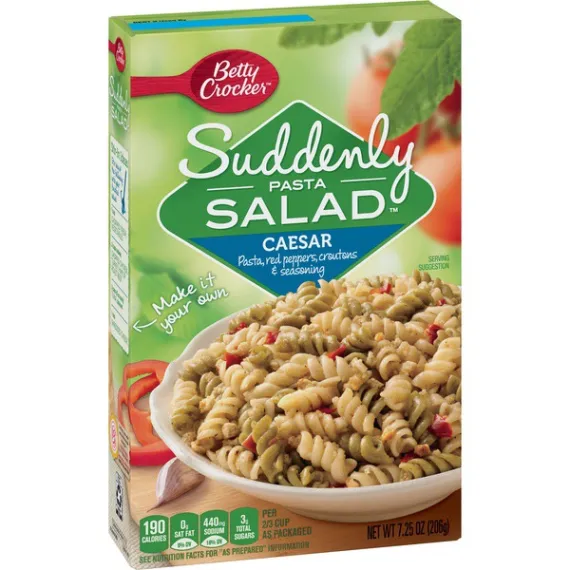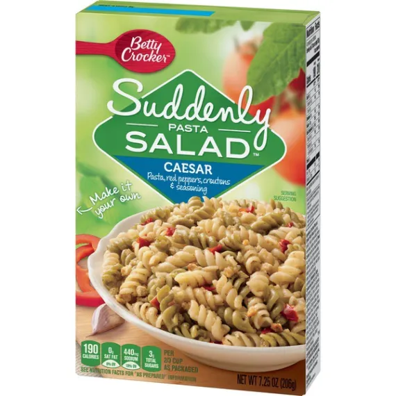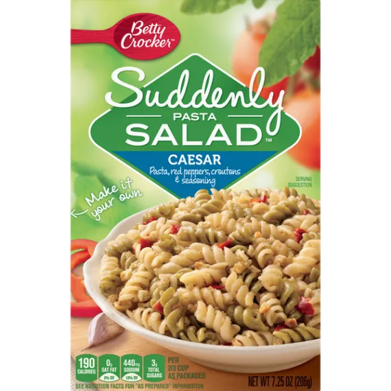 Details Ingredients Enriched Plain and Spinach Rotini Pasta (Wheat Flour, Spinach*, Niacin, Ferrous Sulfate, Thiamin Mononitrate, Riboflavin, Folic Acid), Bread Crumbs (Enriched Flour Bleached [Wheat Flour, Niacin, Iron, Thiamin Mononitrate,Riboflavin, Folic Acid], Vinegar, Sugar, Salt, Baking Soda, Caramel Color, Yeast, Spice Extract, Ascorbic Acid [Dough Conditioner]), Maltodextrin, Sugar, Contains Less than 2% of: Salt, Red Bell Peppers*, Monosodium Glutamate, Citric Acid, Garlic*, Onion*, Lactic Acid, Vegetable Oil (Canola, Soybean and/or Sunflower Oil), Calcium Lactate, Spice, Basil, Natural Flavor, Parmesan Cheese (Milk, Cheese Cultures, Salt, Enzymes), Whey Protein Concentrate, Yeast Extract, Guar Gum, Hydrolyzed Soy Protein, Caramel Color, Silicon Dioxide (Anticaking Agent), Whey, Sodium Phosphate, Molasses*.*Dried. Show more Product features Festive and full of flavor, our Suddenly Salad Caesar recipe combines bi-colored pasta with traditional Caesar ingredients, including red peppers, croutons and Italian seasonings. Just add oil and serve as a side or top with cubed chicken for a main dish; the possibilities are endless. DRY MEAL MIX: Suddenly Pasta Salad in your favorite Caesar salad flavor; perfect for lunch, dinner or on the side FULL OF FLAVOR: Pasta mix combines bi-colored pasta noodles with traditional Caesar ingredients, including red peppers, croutons and Italian seasonings QUICK AND EASY: Make pasta salad without the usual mess; simply boil noodles, rinse with cold water and drain, and stir in seasoning ENDLESS OPTIONS: Serve as a side, top with cubed chicken for a main dish or head to the Betty Crocker website for additional pasta salad recipes the whole family will love BOX CONTAINS: One pack of Caesar pasta salad, 7.25 oz box; makes four servings Suddnely Salad, Pasta Salad, Dry Pasta, Pasta Salad, Salad Kit Net Quantity of Content 4 X 1.0
