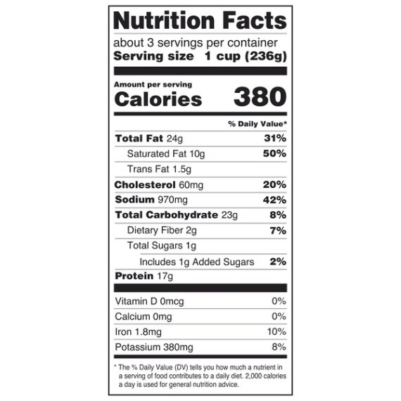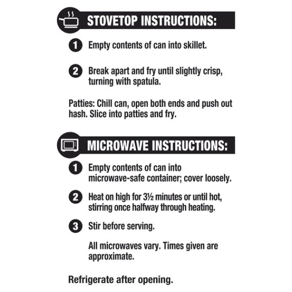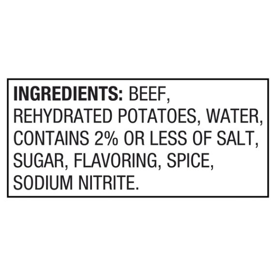 Details Ingredients BEEF, REHYDRATED POTATOES, WATER, CONTAINS 2% OR LESS OF SALT, SUGAR, FLAVORING, SPICE, SODIUM NITRITE. Product features Bring the timeless, home cooked flavor of corned beef hash to your family’s breakfast or dinner table quickly and easily with Great Value Corned Beef Hash. This delicious hash is made with savory corned beef chunks, diced potatoes, and delectable seasonings- just like you remember. You can just heat and eat the corned beef hash as is or use it as the base for some family-favorite recipes. Fry it in a skillet until crispy and serve with some fried eggs and toast, add it to omelets for a savory change of pace, use it as a filling with scrambled eggs in a breakfast burrito, or top some tortilla chips with corned beef hash, jalapeno, cilantro, and shredded cheese for a new spin on nachos! Serve up some Great Value Corned Beef Hash tonight and create a new family favorite! Great Value products provide families with affordable, high quality grocery and household consumable options. With our wide range of product categories spanning grocery and household consumables, we offer you a variety of products for your family's needs. Our products are conveniently available online and in Walmart stores nationwide, allowing you to stock up and save money at the same time. Great Value Corned Beef Hash, 25 oz Classic, delicious favorite Great on its own or used as the base for recipes USDA inspected and passed About 3 servings per can