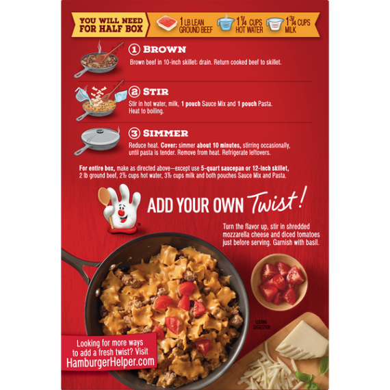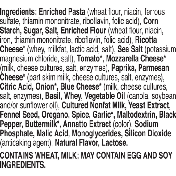 Details Ingredients Enriched Pasta (Wheat Flour, Niacin, Ferrous Sulfate, Thiamin Mononitrate, Riboflavin, Folic Acid), Corn Starch, Sugar, Salt, Enriched Flour (Wheat Flour, Niacin, Iron, Thiamin Mononitrate, Riboflavin, Folic Acid), Ricotta Cheese* (Whey, Milkfat, Lactic Acid, Salt), Sea Salt (Potassium Magnesium Chloride, Salt), Tomato*, Mozzarella Cheese* (Milk, Cheese Cultures, Salt, Enzymes), Paprika, Parmesan Cheese* (Part Skim Milk, Cheese Cultures, Salt, Enzymes), Citric Acid, Onion*, Blue Cheese* (Milk, Cheese Cultures, Salt, Enzymes), Basil, Whey, Vegetable Oil (Canola, Soybean and/or Sunflower Oil), Cultured Nonfat Milk, Yeast Extract, Fennel Seed, Oregano, Spice, Garlic*, Maltodextrin, Black Pepper, Buttermilk*, Annatto Extract (Color), Sodium Phosphate, Malic Acid, Monoglycerides, Silicon Dioxide (Anticaking Agent), Natural Flavor, Lactose. Show more Product features America's favorite Hamburger Helper is made with 100% REAL cheese and Italian-style herbs for the classic taste you love most. Our products are made with NO artificial flavors or colors from artificial sources. Add Your Own Twist! Turn the flavor up! Stir in shredded mozzarella cheese and diced tomatoes just before serving. Garnish with fresh basil. No Artificial Flavors or Colors From Artificial Sources Made with 100% Real Cheese & Italian-style Herbs Twin Pack: 1 for now, 1 for later Meal Kit, Dry Dinner Kit, One Skillet Meal, Helpers, Hamburger Helper, Packaged Meal Net Quantity of Content 10 X 30.0