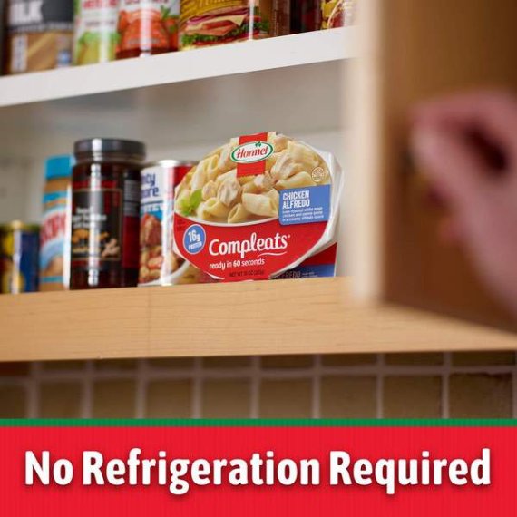 Details Ingredients Water, Penne Pasta (Water, Durum Wheat, Egg Whits, Niacin, Ferrous Sulfate, Thiamine Mononitrate, Riboflavin, Folic Acid), White Chicken (White Chicken Meat, Water, Modified food Starch, Salt, Sodium Phosphates), Alfredo Sauce (Water, Partially Hydrogenated Soybean Oil, Mozzarella Cheese [Milk, cheese Cultures, Salt, Enzymes], Food Starch, Stabilizer [Modified Food Starch, Sodium Alginate, Datem, Locust Bean Gum, Guar Gum, Maltodextrin], Natural Flavor, Sodium Phosphate, Salt, Sorbic Acid [Preservative]), Cream (Contains Carragenan), Contains 2% or Less of Soybean Oil, Rice Potassium Chloride, Flavor (Maltodextrin, Cultured Whey [From Milk], Milk Protein Concentrate (Nonfat Milk, Milk Protein), Disodium Inosinate and Disodium Gunaylate, Spices, Titanium Dioxide (Color), Cream of Tartar.) Show more Product features Stay satisfied with HORMEL COMPLEATS Chicken Alfredo. A meal-time favorite made with roasted white meat chicken, penne pasta, and a flavorful alfredo sauce that goes from microwave to table with little prep needed or clean-up required. HORMEL COMPLEATS meals make a great easy dinner and are perfect for any quick meals. Real food, real fast. COMPLEATS is a trademark of Hormel Foods, LLC. Protein packed with 16 grams per meal Shelf stable; no refrigeration needed Affordable and easy to use Prepared meals, fully cooked, ready to eat in 60 seconds 10 ounce microwave meal Special Features Us inspected by dept Of agriculture Net Quantity of Content 1 X 283 g