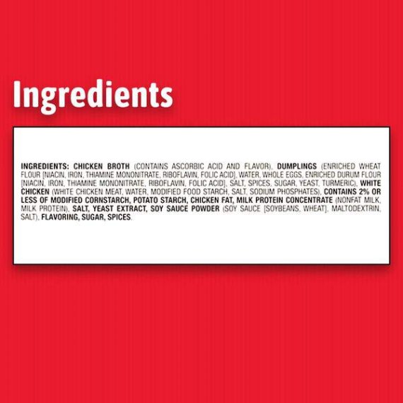 Details Ingredients chicken Broth (Contains Ascorbic Acid and Flavor), Dumplings (Enriched Wheat flour [Niacin, Iron, Thiamine Mononitrate, Riboflavin, Folic Acid], Water, Whole Eggs, Enriched Durum Flour [Niacin, Iron, Thiamin Mononitrate, Riboflavin, Folic Acid], Salt, Spices, Sugar, Yeast, Turmeric), White Chicken (White Chicken Meat, Water, Modified Food Starch, Salt, Sodium Phosphates), Contains 2% or Less of Modified Cornstarch, Potato Starch, Chicken Fat, Milk Protein Concentrate (Nonfat Milk, Milk Protein), Salt, Yeast Extract, Soy Sauce Powder (Soy Sauce [Soybeans, Wheat], Maltodextrin, Salt), Flavoring, Sugar, Spices. Show more Product features Stay satisfied with HORMEL COMPLEATS Dumplings & Chicken. This hearty classic is an easy-to-prepare microwave meal of plump dumplings, wholesome, tender white meat chicken, and a savory gravy. HORMEL COMPLEATS meals make a great easy dinner and are perfect for any quick meals, with little prep needed or clean-up required. Real food, real fast. COMPLEATS is a trademark of Hormel Foods, LLC. 8 grams of protein; no artificial ingredients Shelf stable; no refrigeration needed Affordable and easy to use Prepared meals, fully cooked, ready to eat in 60 seconds 7.5 ounce microwave meal Special Features Us inspected by dept Of agriculture Net Quantity of Content 1 X 213 g