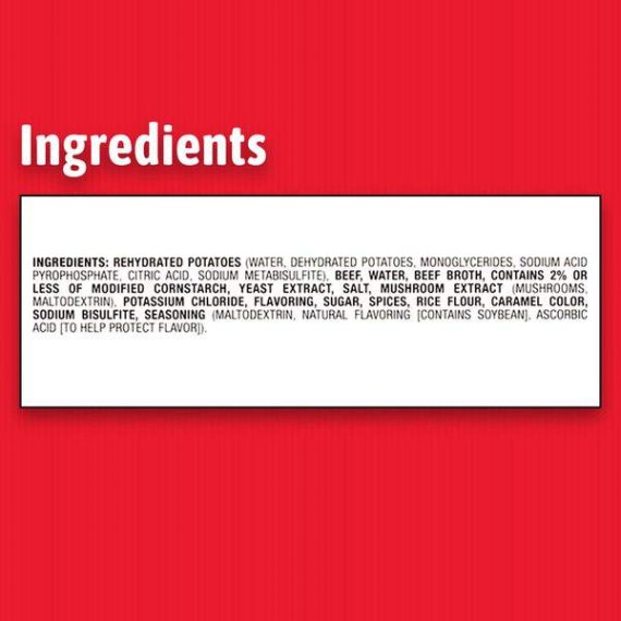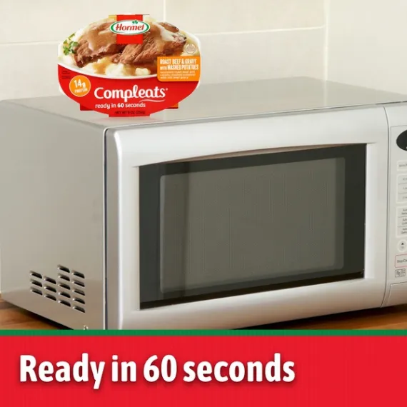 Details Ingredients Rehydrated Potatoes (Water, Potatoes, Mono-and Digycerides, Sodium Acid Pyrophosphate, Citric Acid), Beef (Beef, Water, Salt), Beef Stock, Contains 2% or Less of Water, Modified Cornstarch, Yeast Extract, Mushroom Extract (Mushrooms, Maltodextrin), Potassium Chloride, Flavoring, Salt, Spices, Sugar, Rice Flour, Caramel Color, Sodium Bisulfite, Seasoning (Maltodextrin, Natural Flavoring [Contains Soybean], Ascorbic Acid [To Help Protect Flavor]). Show more Product features Stay satisfied with HORMEL COMPLEATS Roast Beef and Mashed Potatoes with Gravy. Packed with 14 grams of protein and lots of beefy flavor, you can enjoy this nutritious, microwavable meal at home or work. HORMEL COMPLEATS meals make a great easy dinner and are perfect for any quick meals, with little prep needed or clean-up required. Real food, real fast. COMPLEATS is a trademark of Hormel Foods, LLC. Protein packed with 14 grams per meal Shelf stable; no refrigeration needed Affordable and easy to use Prepared meals, fully cooked, ready to eat in 60 seconds 10 ounce microwave meal Special Features Us inspected by dept Of agriculture Net Quantity of Content 1 X 255 g