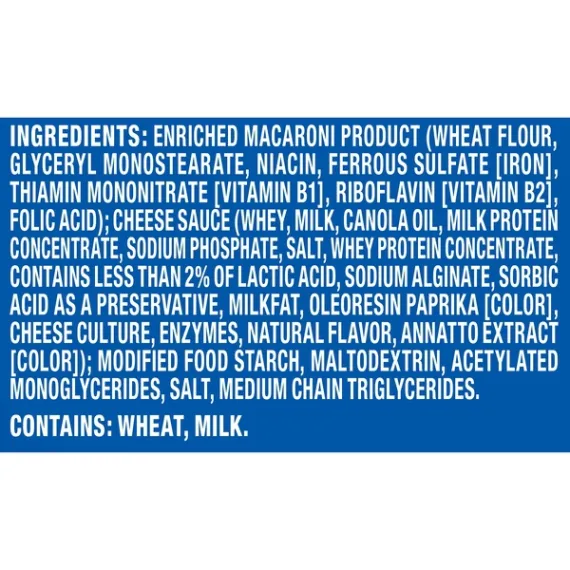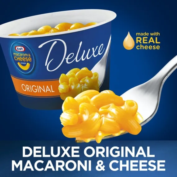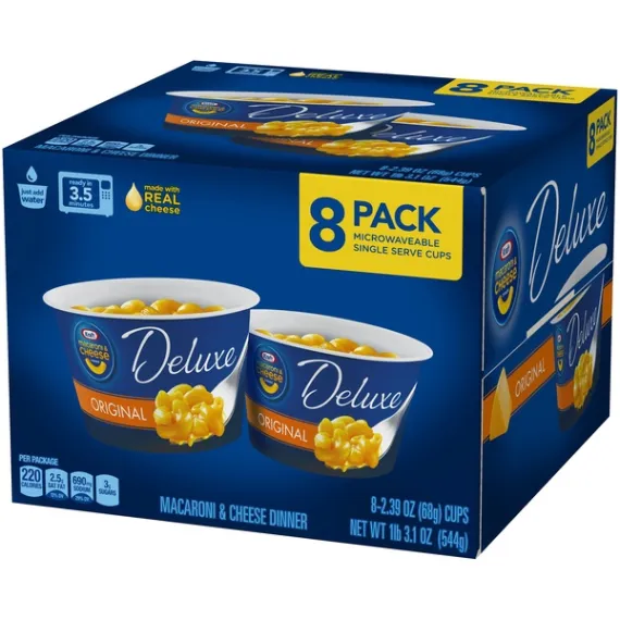 Details Ingredients Enriched Macaroni Product (Wheat Flour, Glyceryl Monostearate, Niacin, Ferrous Sulfate [Iron], Thiamin Mononitrate [Vitamin B1], Riboflavin [Vitamin B2], Folic Acid); Cheese Sauce (Whey, Milk, Canola Oil, Milk Protein Concentrate, Sodium Phosphate, Salt, Whey Protein Concentrate, Contains Less Than 2% Of Lactic Acid, Sodium Alginate, Sorbic Acid As A Preservative, Milkfat, Oleoresin Paprika [Color], Cheese Culture, Enzymes, Natural Flavor, Annatto Extract [Color]); Modified Food Starch, Maltodextrin, Acetylated Monoglycerides, Salt, Medium Chain Triglycerides. Show more Product features It's hard to improve upon a classic. Take a taste of familiarity wherever you go with Kraft Deluxe Easy Mac Microwavable Macaroni & Cheese cups. They're conveniently packaged as individual servings so you'll never cook up more than you can eat—if you can contain yourself to only one delicious cup, that is. Kraft Deluxe Easy Mac Microwavable Macaroni and Cheese is a simple dinner by itself or as a side dish; just add water, microwave and you're set! Store on a dry shelf. Eight 19 Ounce cups of Kraft Deluxe Easy Mac Microwavable Macaroni & Cheese Each cup is full of the familiar gooey Kraft mac and cheese you've always loved Perfect size for an on-the-go snack or an office meal Store on a dry shelf—no refrigeration required Contains 7g of protein per cup Net Quantity of Content 8.0 X 1 Package (68g)