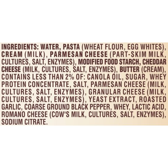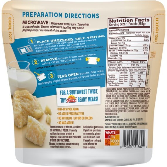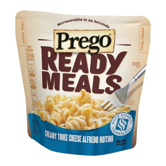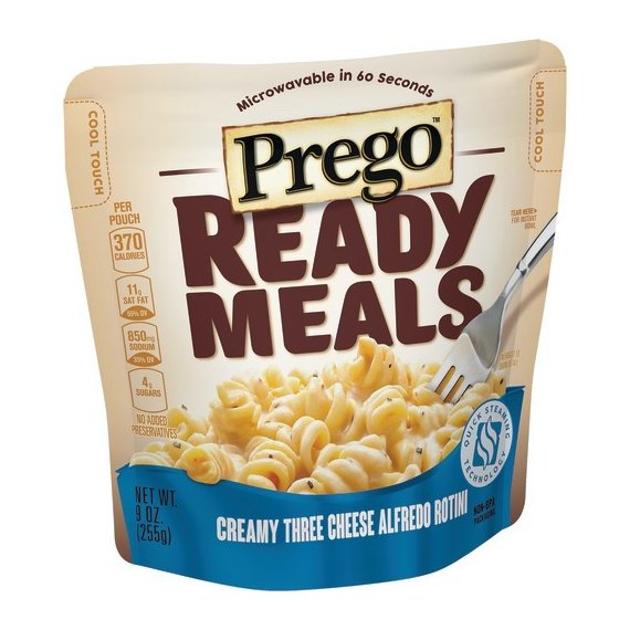 Details Ingredients Ingredients: Water, Pasta (Wheat Flour, Egg Whites), Cream (Milk), Parmesan Cheese (Part Skim Milk, Cultures, Salt, Enzymes), Modified Food Starch, Cheddar Cheese (Milk, Cultures, Salt, Enzymes), Butter (Cream), Contains Less Than 2% Of: Canola Oil, Sugar, Whey Protein Concentrate, Salt, Parmesan Cheese (Milk, Cultures, Salt, Enzymes), Granular Cheese (Milk, Cultures, Salt, Enzymes), Yeast Extract, Roasted Garlic, Coarse Ground Black Pepper, Whey, Lactic Acid, Romano Cheese (Cow's Milk, Cultures, Salt, Enzymes), Sodium Citrate. Show more Product features Prego Ready Meals Creamy Three Cheese Alfredo Rotini is a tasty option for your busy lifestyle. Packaged in a convenient microwaveable pouch, enjoy the homemade taste of tender rotini pasta in a rich and creamy Alfredo sauce seasoned with black pepper without messing up the kitchen. Delicious! DELICIOUS & SATISFYING: Tasty blend of tender rotini pasta, creamy Alfredo sauce and black pepper EASY & CONVENIENT: Heat and eat right from the non-BPA pouch for a quick work lunch or easy dinner at home or in a dorm HIGH-QUALITY INGREDIENTS: No high-fructose corn syrup MICROWAVABLE: The non-BPA pouch is safe to microwave and eat from, so just heat for one minute, grab and fork, and enjoy! ONE MEAL PER POUCH: One pouch is 9 ounces, which is one full meal and just 370 calories Net Quantity of Content 1.0 X 1 POUCH (255g)