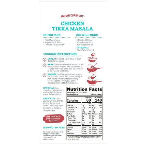 Details Ingredients Tomato Puree (Water, Tomato Paste), Onion, Tomatoes, Garlic, Ginger, Herb & Spices, Sunflower Oil, Yogurt Powder (Sugar, Skim Milk Powder, Maltodextrin, Xanthan Gum), Salt, White Vinegar, Corn Starch, Brown Sugar, Almond Meal, Turmeric & Turmeric Extract, Citric Acid, Paprika Extract, Xanthan Gum, Guar Gum. Contains Gluten, Milk & Almonds. Show more Product features Each kit is inspired by food trucks that are 100% authentic street food from around the world. Each scratch kit has 3 separate components of pre measured ingredients. Takes the guess work out and eliminates waste. ST KIT MASALA Net Quantity of Content 4 X 0.25 Cup