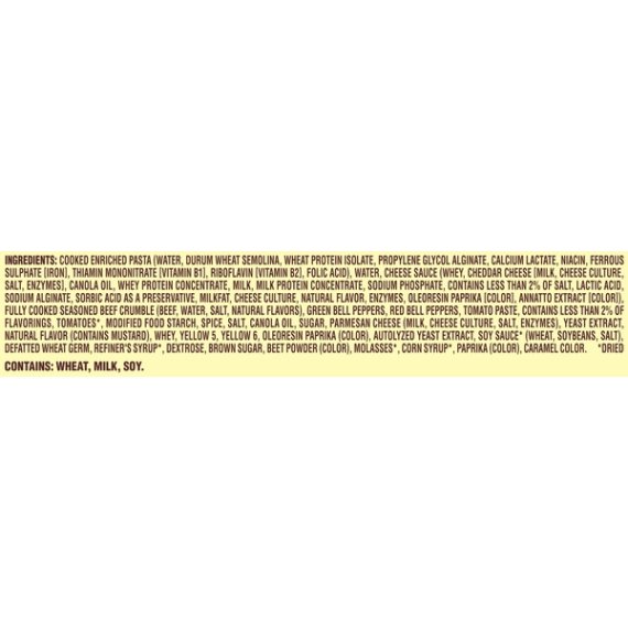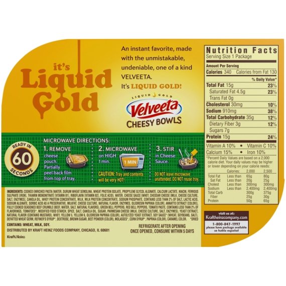 Details Ingredients Cooked Enriched Pasta (Water, Durum Wheat Semolina, Wheat Protein Isolate, Propylene Glycol Alginate, Calcium Lactate, Niacin, Ferrous Sulphate [Iron], Thiamin Mononitrate [Vitamin B1], Riboflavin [Vitamin B2], Folic Acid), Water, Cheese Sauce (Whey, Cheddar Cheese [Milk, Cheese Culture, Salt, Enzymes], Canola Oil, Whey Protein Concentrate, Milk, Milk Protein Concentrate, Sodium Phosphate, Contains Less Than 2% Of Salt, Lactic Acid, Sodium Alginate, Sorbic Acid As A Preservative, Milkfat, Cheese Culture, Natural Flavor, Enzymes, Oleoresin Paprika [Color], Annatto Extract [Color]), Fully Cooked Seasoned Beef Crumble (Beef, Water, Salt, Natural Flavors), Green Bell Peppers, Red Bell Peppers, Tomato Paste, Contains Less Than 2% Of Flavorings, Tomatoes*, Modified Food Starch, Spice, Salt, Canola Oil, Sugar, Parmesan Cheese (Milk, Cheese Culture, Salt, Enzymes), Yeast Extract, Natural Flavor (Contains Mustard), Whey, Yellow 5, Yellow 6, Oleoresin Paprika (Color), Autolyzed Yeast Extract, Soy Sauce* (Wheat, Soybeans, Salt), Defatted Wheat Germ, Refiner's Syrup*, Dextrose, Brown Sugar, Beet Powder (Color), Molasses*, Corn Syrup*, Paprika (Color), Caramel Color. * Dried Show more Product features Velveeta Cheesy Bowls Lasagna with Meat Sauce brings together the delicious taste of meat sauce with the liquid gold of Velveeta cheese sauce for an easy lasagna meal that's an instant favorite. The deliciously creamy microwave dinner mixes lasagna with meat sauce and tops it with a creamy cheese sauce for a taste so smooth, it's undeniably, unmistakably Velveeta. Every bite is made with meat and premium seasonings, plus the one-of-a-kind taste of Velveeta cheese sauce. Simply pop the lasagna bowl in your microwave for one minute and stir in the cheese sauce to enjoy an easy dinner in record time. Each 9 ounce Velveeta Cheesy Bowl makes one serving just for you. Add a little liquid gold to all your meals with Velveeta. One 9 oz. box of Velveeta Cheesy Bowls Lasagna with Meat Sauce Liquid gold meets meaty sauce in every bite of Velveeta Cheesy Bowls Lasagna with Meat Sauce Bowl includes lasagna noodles with meat sauce and a cheese sauce packet Made with meat This lasagna bowl makes one serving Make this delicious lasagna dinner in the microwave Ready in 60 seconds Special Features Microwaveable Net Quantity of Content 1.0 X 1 Package