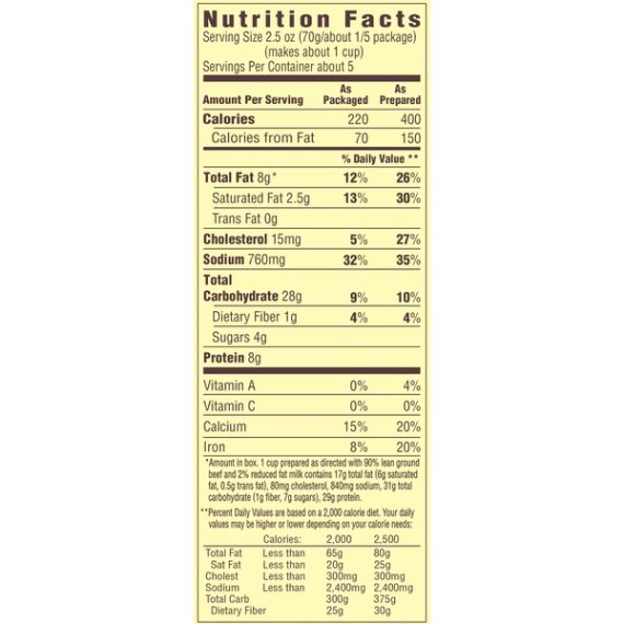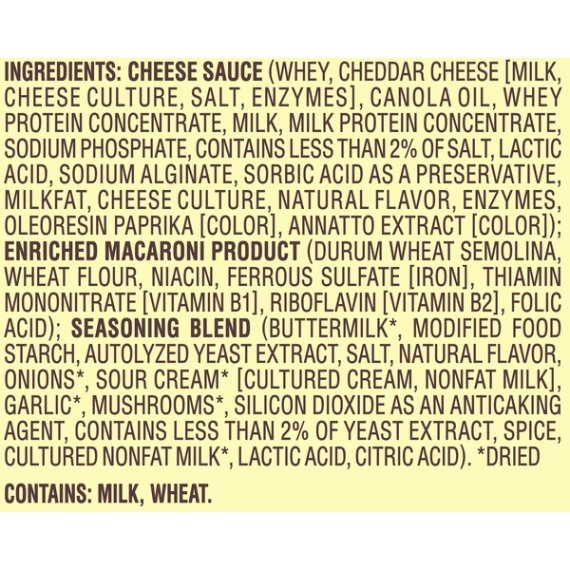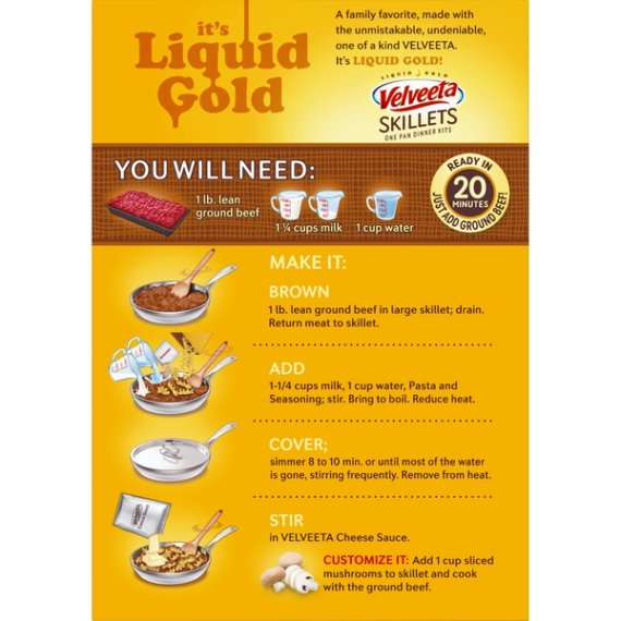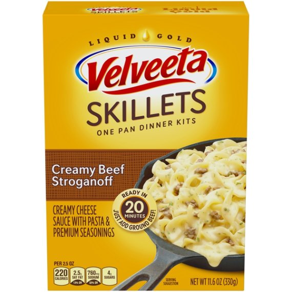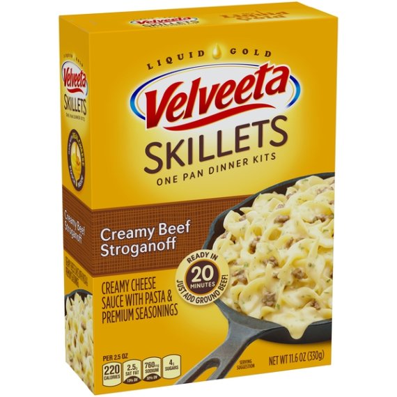 Details Ingredients Ingredients: Cheese Sauce (Whey, Cheddar Cheese [Milk, Cheese Culture, Salt, Enzymes], Canola Oil, Whey Protein Concentrate, Milk, Milk Protein Concentrate, Sodium Phosphate, Contains Less Than 2% Of Salt, Lactic Acid, Sodium Alginate, Sorbic Acid As A Preservative, Milkfat, Cheese Culture, Natural Flavor, Enzymes, Oleoresin Paprika [Color], Annatto Extract [Color]); Enriched Macaroni Product (Durum Wheat Semolina, Wheat Flour, Niacin, Ferrous Sulfate [Iron], Thiamin Mononitrate [Vitamin B1], Riboflavin [Vitamin B2], Folic Acid); Seasoning Blend (Buttermilk*, Modified Food Starch, Autolyzed Yeast Extract, Salt, Natural Flavor, Onions*, Sour Cream* [Cultured Cream, Nonfat Milk], Garlic*, Mushrooms*, Silicon Dioxide As An Anticaking Agent, Contains Less Than 2% Of Yeast Extract, Spice, Cultured Nonfat Milk*, Lactic Acid, Citric Acid). *Dried Show more Product features Velveeta Skillets Creamy Beef Stroganoff Dinner Kit delivers the liquid gold flavor your family loves. This macaroni skillet meal is rich with creamy flavor and cheesy goodness. Each meal kit includes Velveeta cheese sauce, pasta and seasonings. Simply add ground beef, milk and water to this skillet recipe for a family favorite. To prepare this macaroni dinner, brown 1 pound of lean ground beef in a large skillet. Drain the beef and return it to the skillet along with 1 1/4 cups of milk, 2 cups of water, pasta and premium seasoning, simmering for 8-10 minutes. Remove from heat and stir in the Velveeta cheese sauce. To dress up your boxed macaroni dinner, try cooking sliced mushrooms along with the ground beef. One box makes about 5 servings. Add a little liquid gold to all your meals with Velveeta. One 11.6 oz. box of Velveeta Skillets Creamy Beef Stroganoff Dinner Kit Velveeta Skillets Creamy Beef Stroganoff Dinner Kit delivers liquid gold flavor Each box includes creamy Velveeta cheese sauce, pasta and seasonings 8 g. of protein per serving Simply add ground beef, milk and water to this skillet recipe for a family favorite Try cooking sliced mushrooms along with the ground beef One box makes about 5 servings Net Quantity of Content 5.0 X 2.5 oz (70g/about 1/5 package)