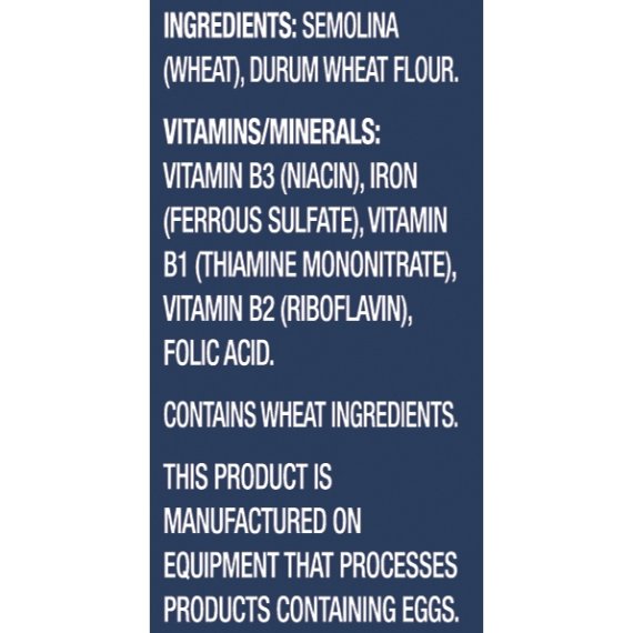 Details Ingredients SEMOLINA (WHEAT), DURUM WHEAT FLOUR. VITAMINS/MINERALS: VITAMIN B3 (NIACIN), IRON (FERROUS SULFATE), VITAMIN B (THIAMINE MONONITRATE), VITAMIN B2 (RIBOFLAVIN), FOLIC ACID. Show more Product features At Barilla®, we're passionate about pasta. After all, we have been pasta makers since 1877. As an Italian family-owned food company, Barilla® pasta is synonymous with high quality and "al dente" perfection every time. Our Spaghetti is made from the finest durum wheat and is non-GMO verified, peanut-free and suitable for a vegan or vegetarian diet. Perfect for twirling, too! Did you know that spaghetti is the most popular shape in Italy? The word spaghetti comes from the Italian word "spaghi", which means "lengths of cord." Twirled properly on a spoon or eaten with just a fork, Barilla® Spaghetti will maintain its authentic shape and hold on to just about any kind of sauce you enjoy. Give Barilla® Spaghetti a twirl! No doubt it's the most fun pasta to eat and its delicious texture will please the whole family. Long, golden strands made with the finest durum wheat semolina. Made with 100% durum wheat and purified water to deliver great taste and "al dente" texture every time. Pairs well with just about any type of sauce you like: simple tomato or a hearty meat sauce, a chunky vegetable or a creamy carbonara sauce. Special Features Al dente perfection in 9-10 minutes Net Quantity of Content ABOUT 8 X 2 oz
